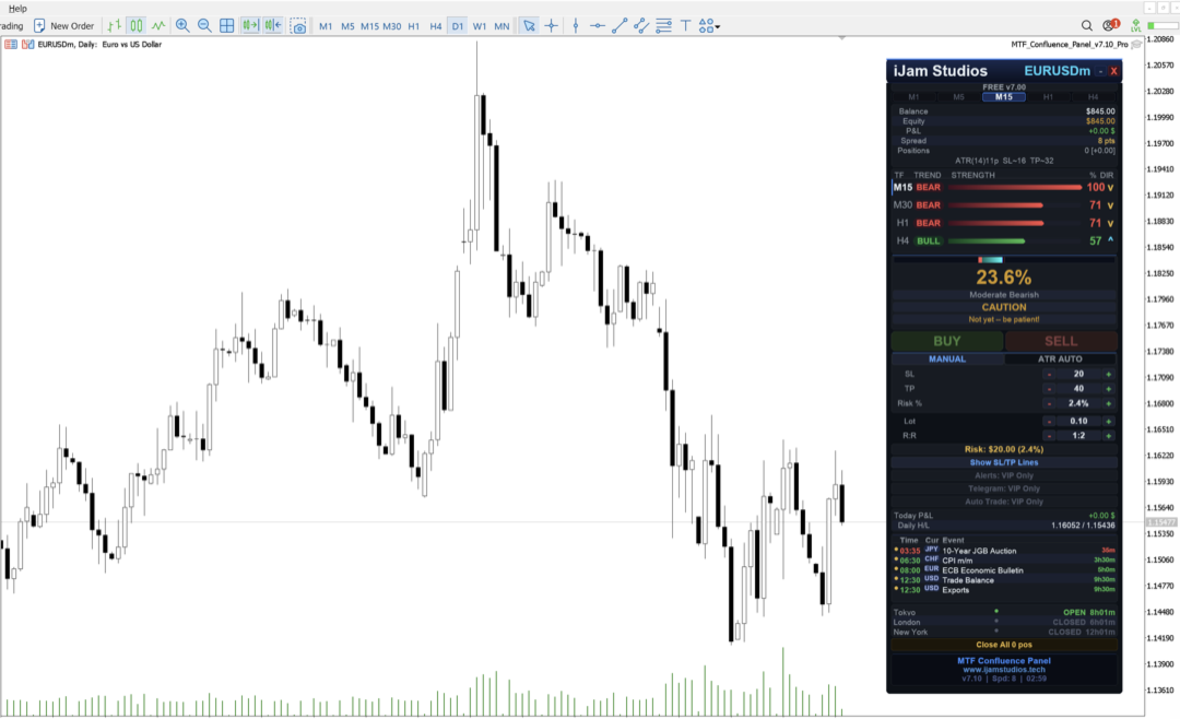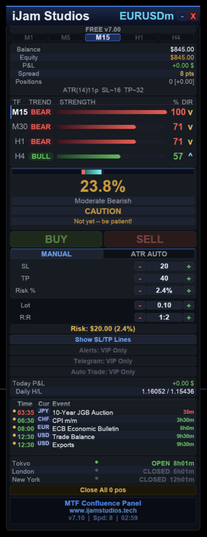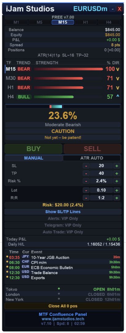 - Session clocks: Tokyo, London, New York with countdown
