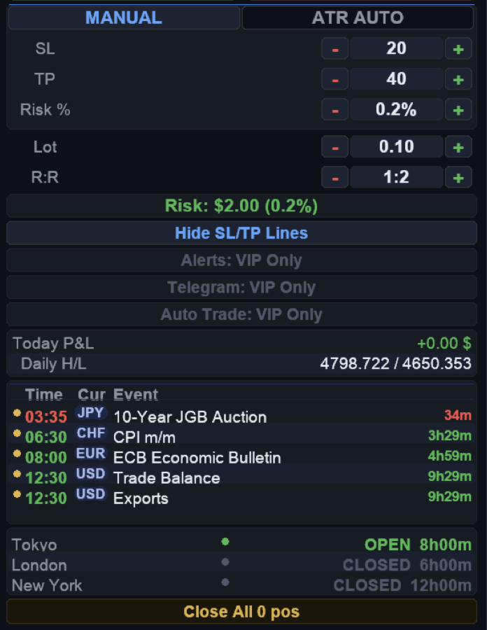 - Account info: Balance, Equity, P&L, Spread, Daily High/Low