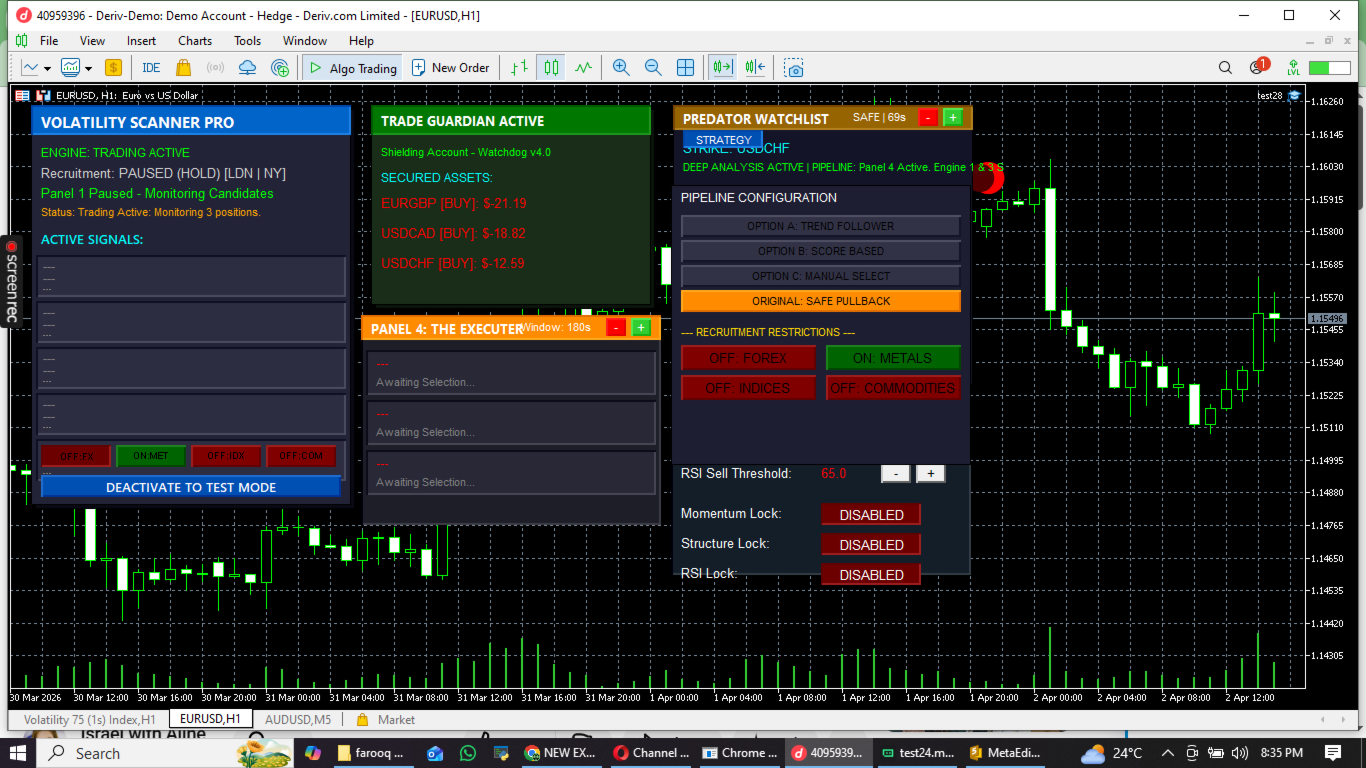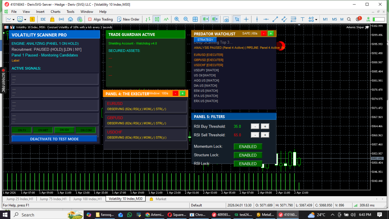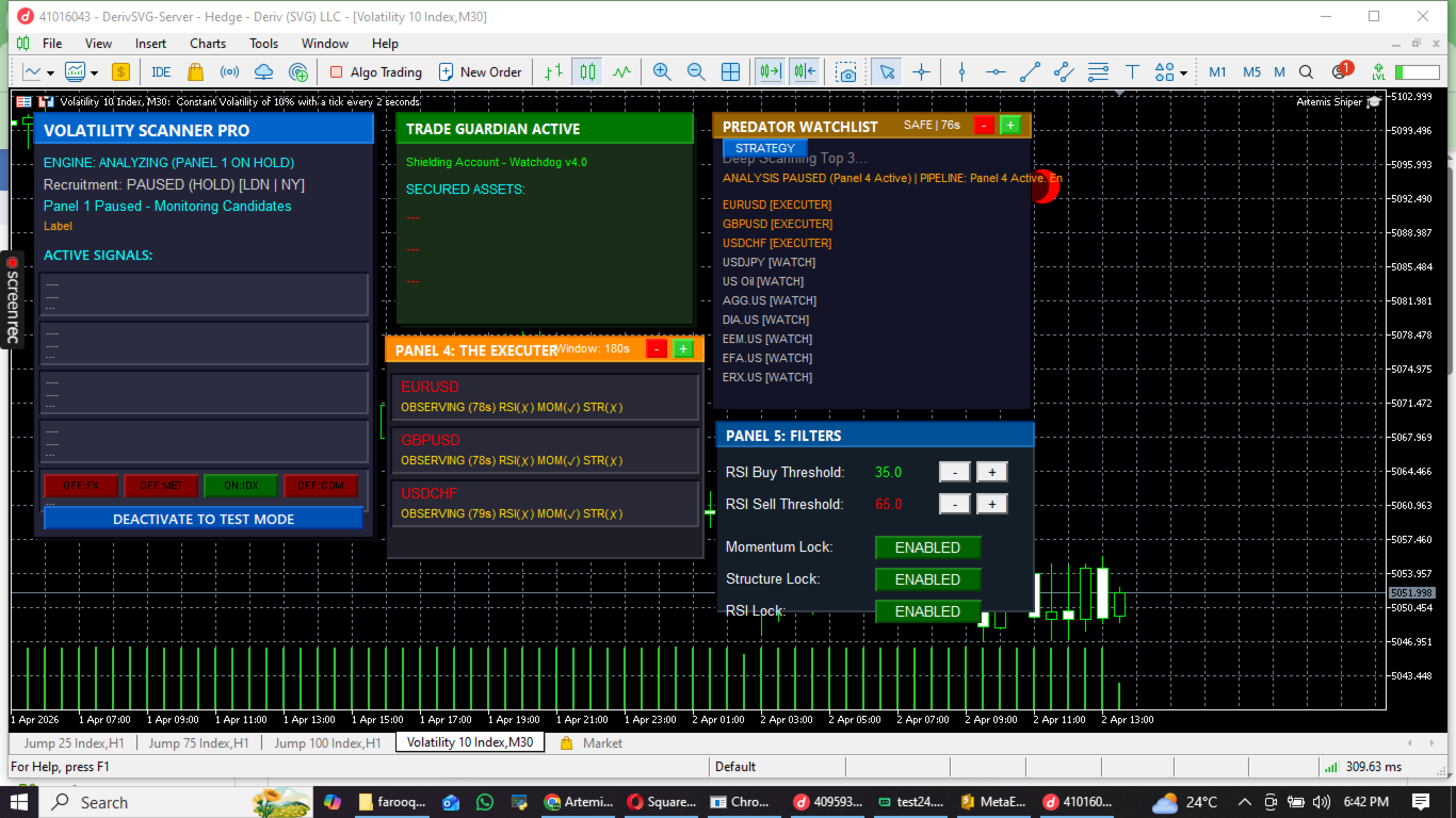 - Panel 4: The Executer : A high-precision strike module that monitors the Elite 3 on the M1 timeframe. It uses a "Triple-Lock" system (RSI + Momentum + Structure) to execute the perfect entry.