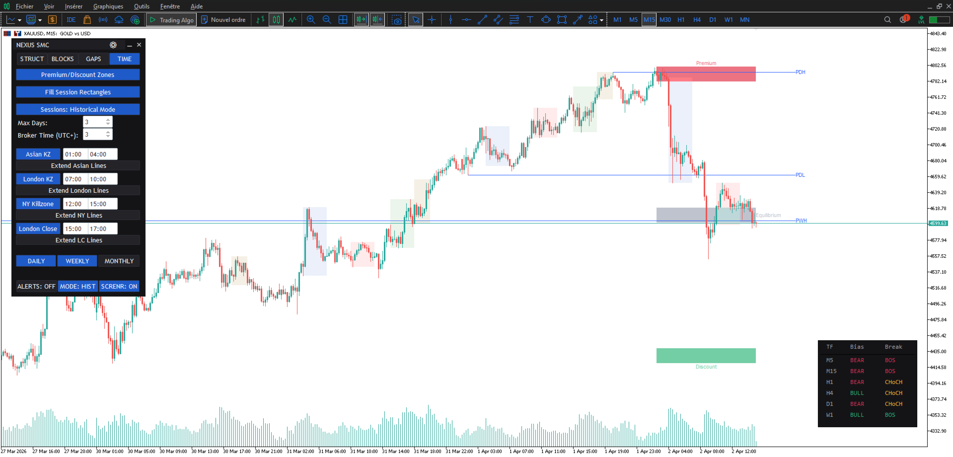 Time Tools: Premium/Discount zones, Asian/London/NY/LC killzones, Daily/Weekly/Monthly levels.