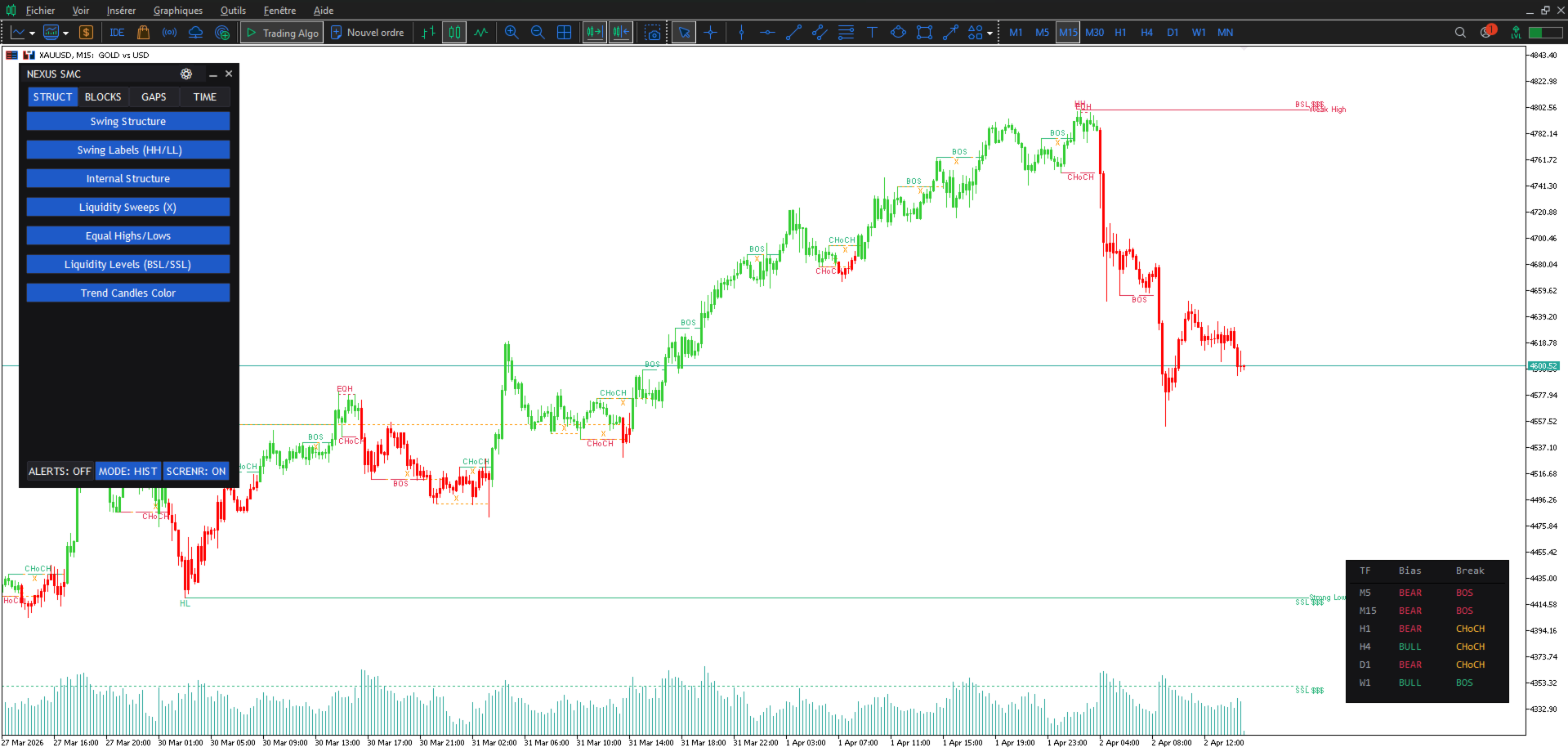 MTF Dashboard: M5-W1 bias detection, BOS/CHoCH indicators, Draggable Panel.