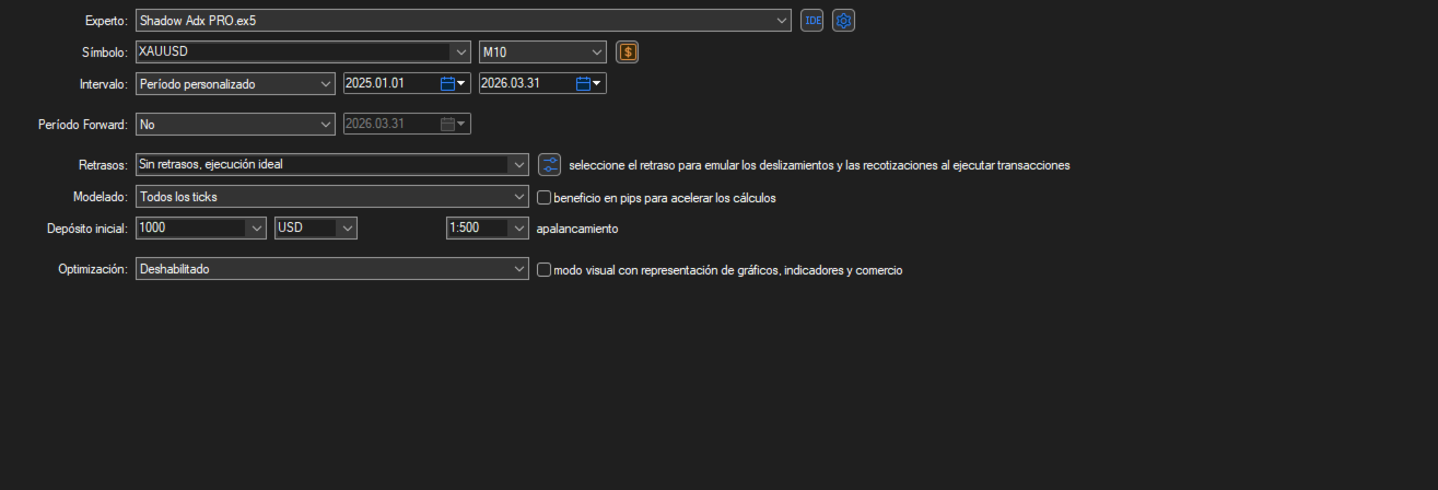 Shadow ADX Pro is a high-precision quantitative Expert Advisor designed exclusively for trading the XAU/USD pair (Gold vs. US Dollar) on the M10 timeframe. It combines the detection of institutional market structures with a dual technical filtering system based on ADX and Parabolic SAR, aimed at capturing trend movements with momentum confirmation and liquidity sweeps.