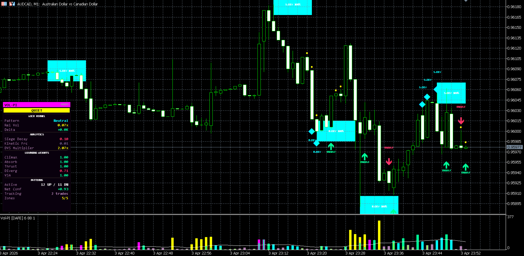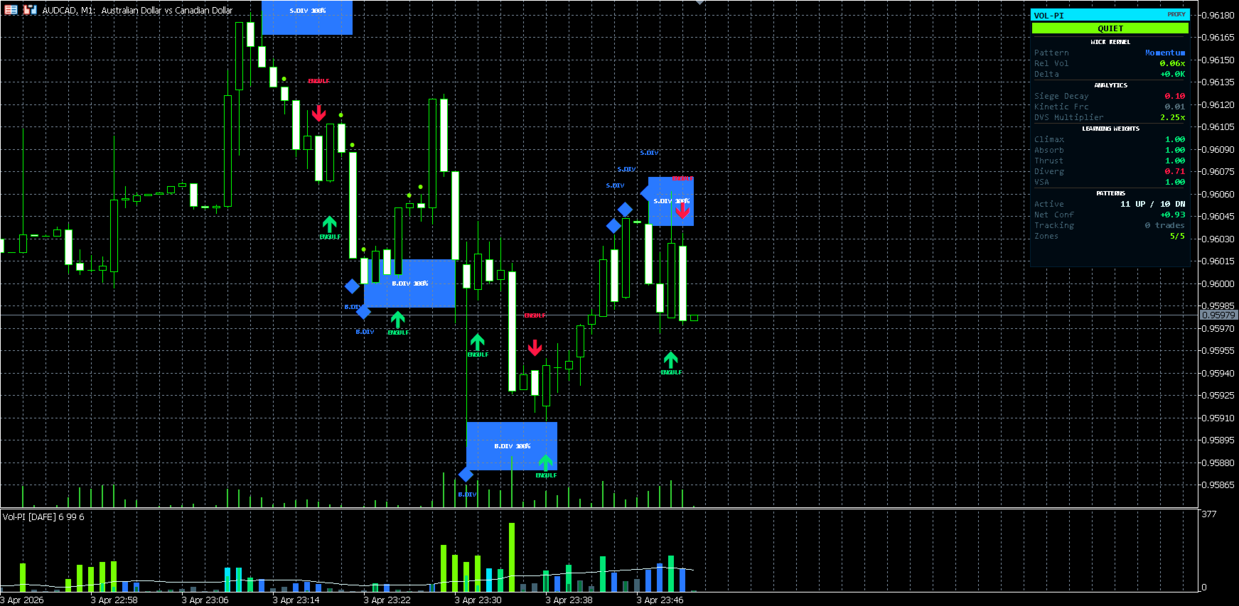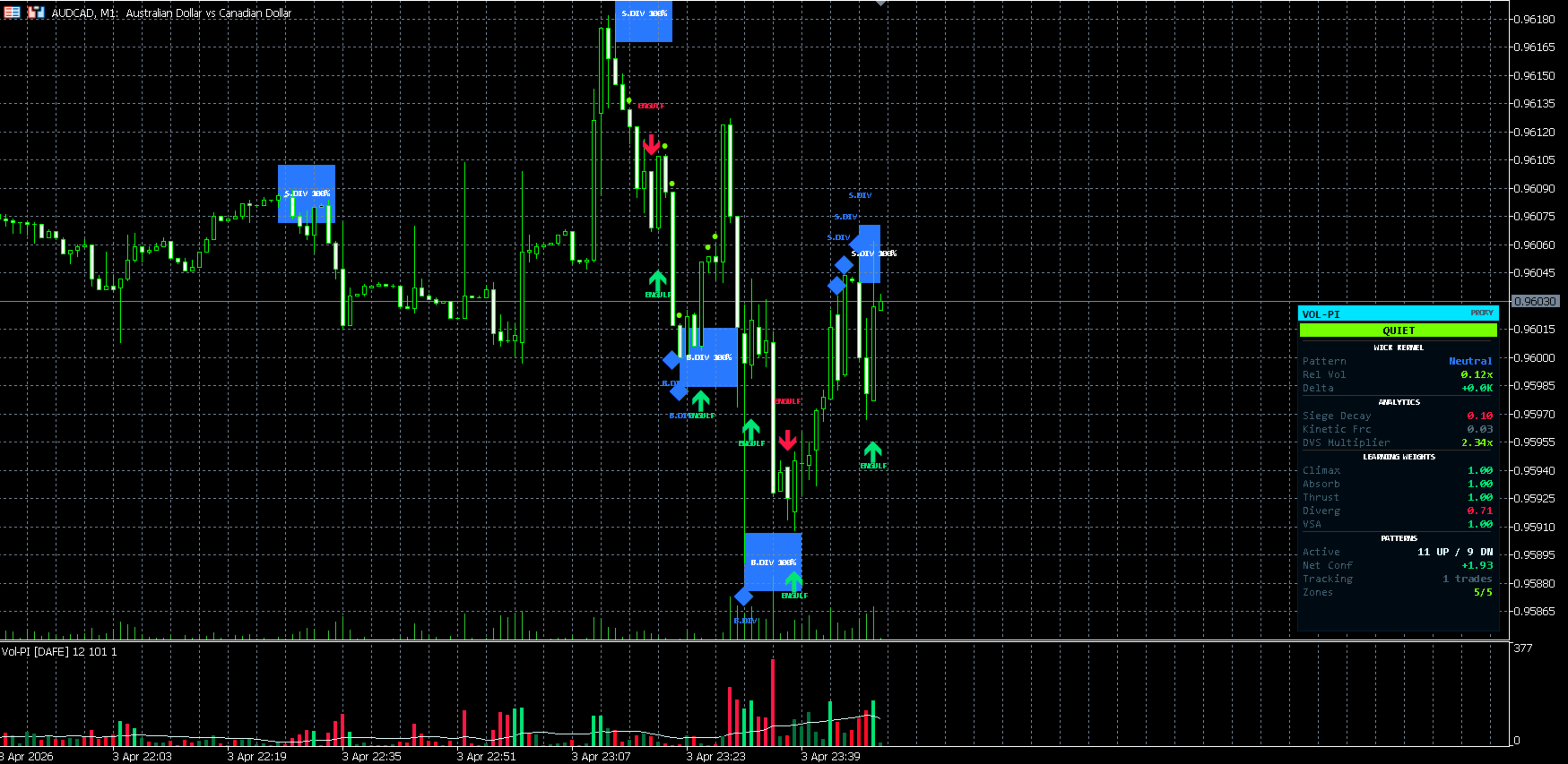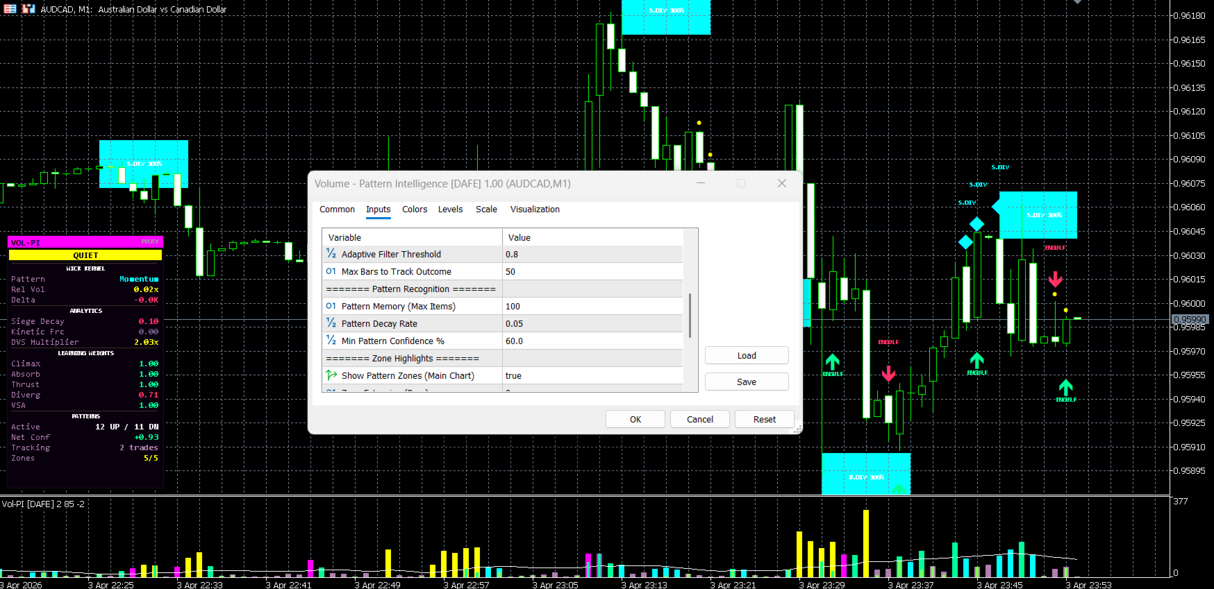 Volume Pattern Intelligence [DAFE] is a professional volume analysis indicator for MetaTrader 5, built around institutional order flow concepts including Volume Spread Analysis, tick delta decomposition, adaptive pattern learning, and dynamic volatility scaling.