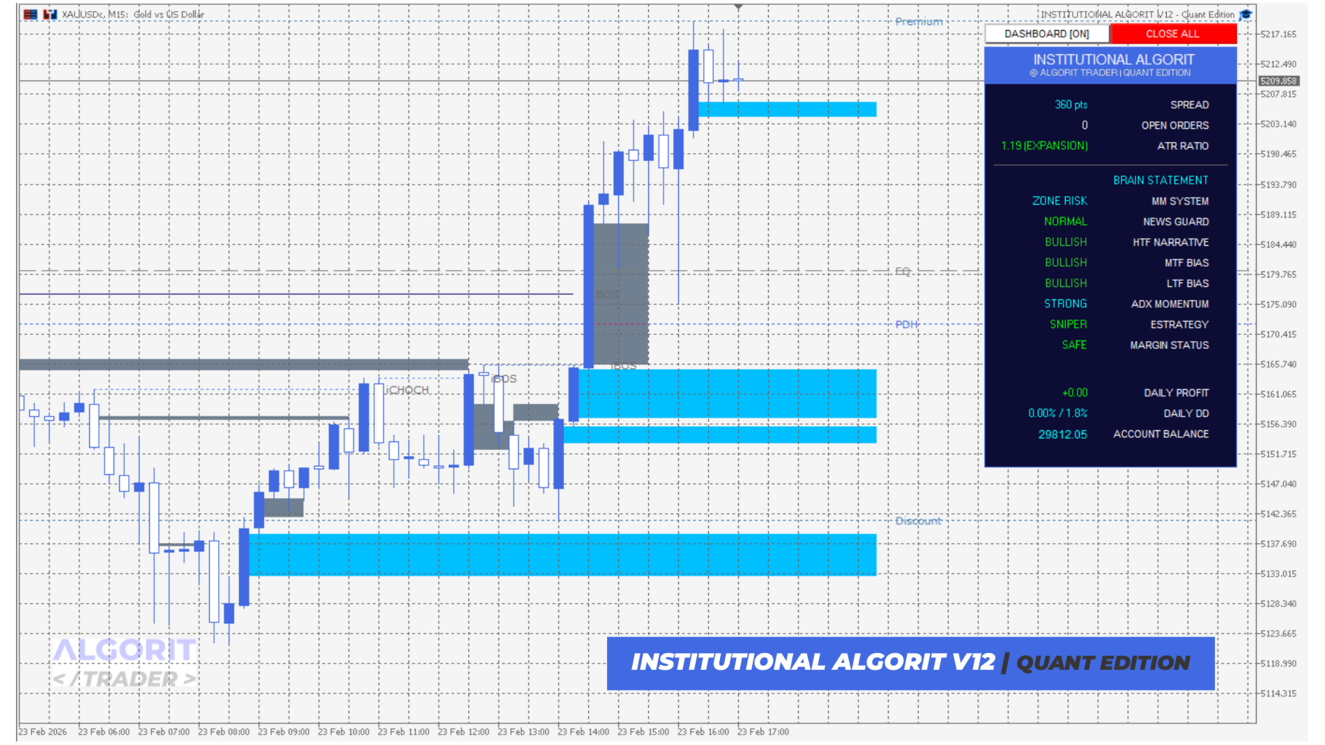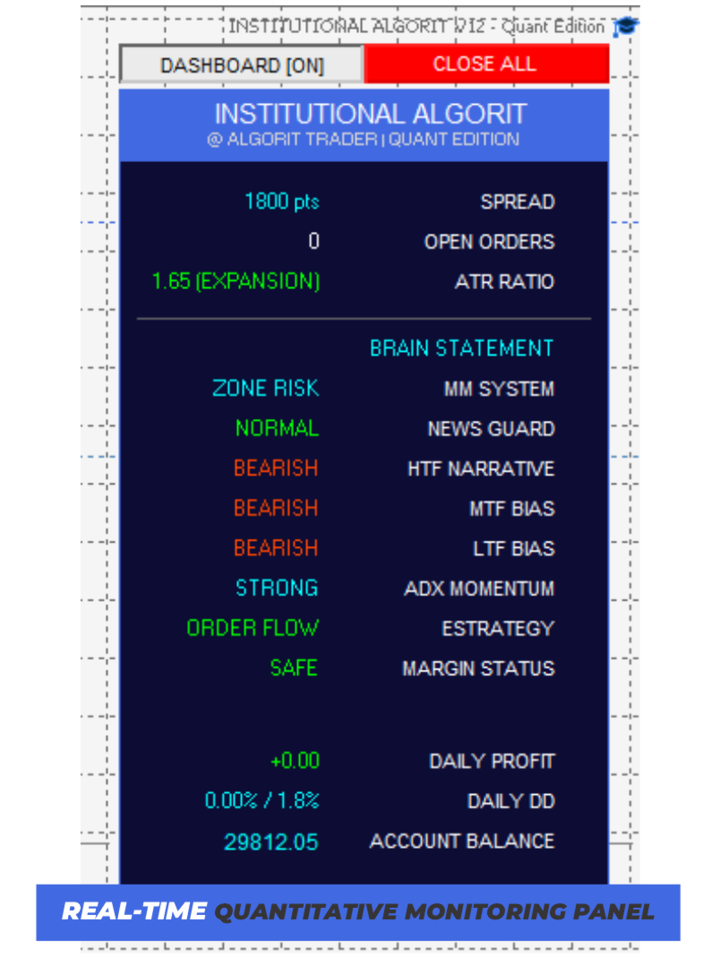 Algorit Trader è un sistema di trading algoritmico ad alta precisione progettato secondo i più rigorosi standard di Ingegneria Finanziaria. Questo Expert Advisor (EA) non si limita a cercare punti di ingresso; analizza la narrativa istituzionale fondendo i concetti di Smart Money (SMC), le metodologie ICT e l'analisi quantitativa della volatilità.