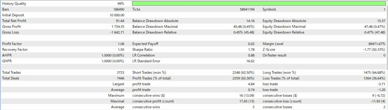 | EURUSD M5 | Every Tick | 1.18 | 94.0% | 0.27% | ~1,400 |