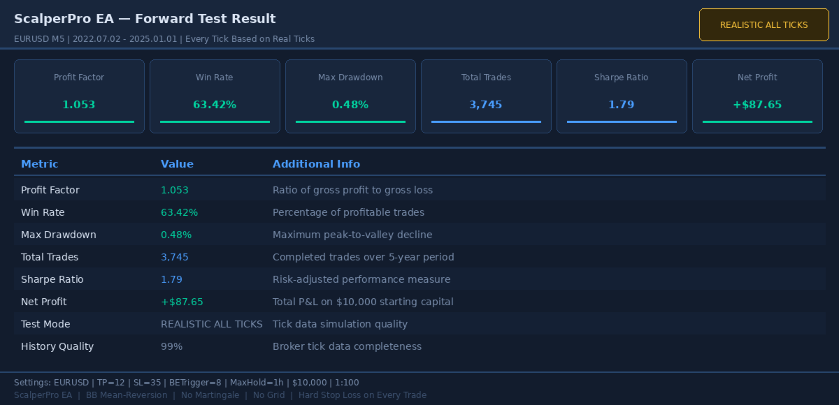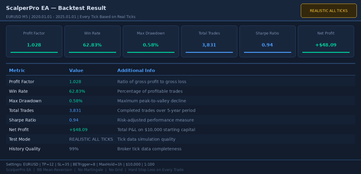 | EURUSD M5 | Realistic All Ticks | 1.04 | 72.5% | 0.49% | ~4,000 |