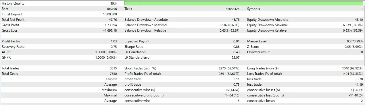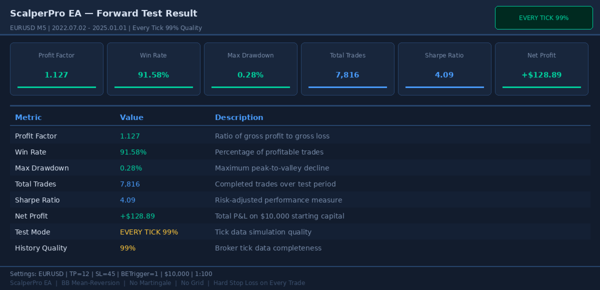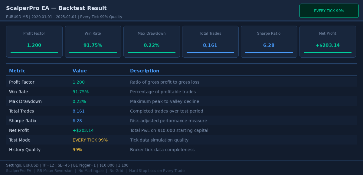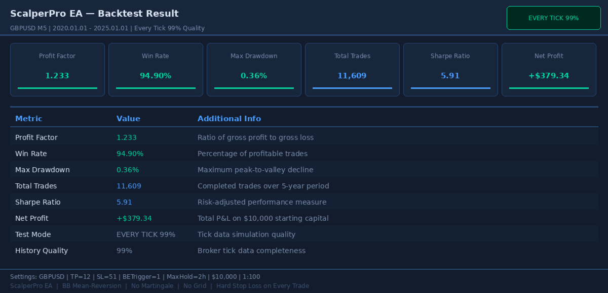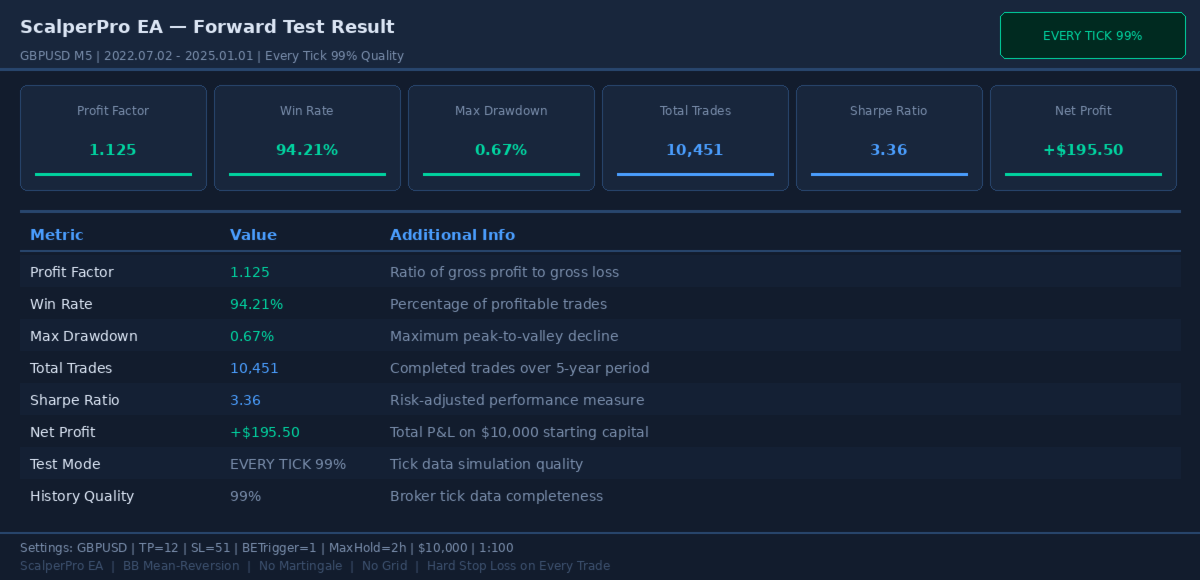 | GBPUSD M5 | Every Tick | 1.12 | 94.2% | 0.67% | ~2,000 |