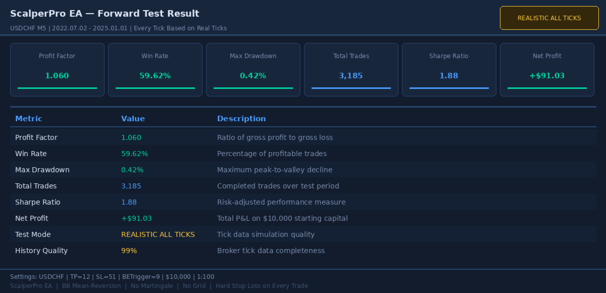 | USDCHF M5 | Every Tick | 1.14 | 93.0% | 0.46% | ~1,200 |