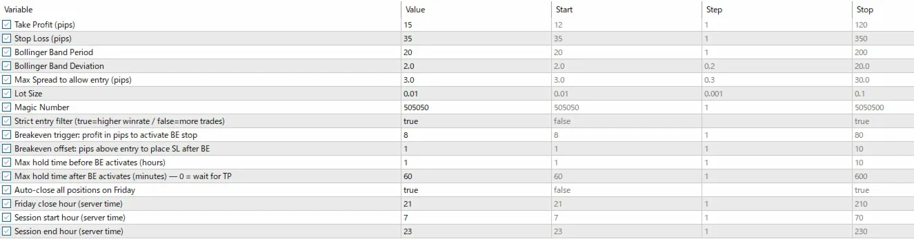 | MaxSpread | 3.0 | 1.5–3.0 | Skip entry if current spread exceeds this value (pips) |