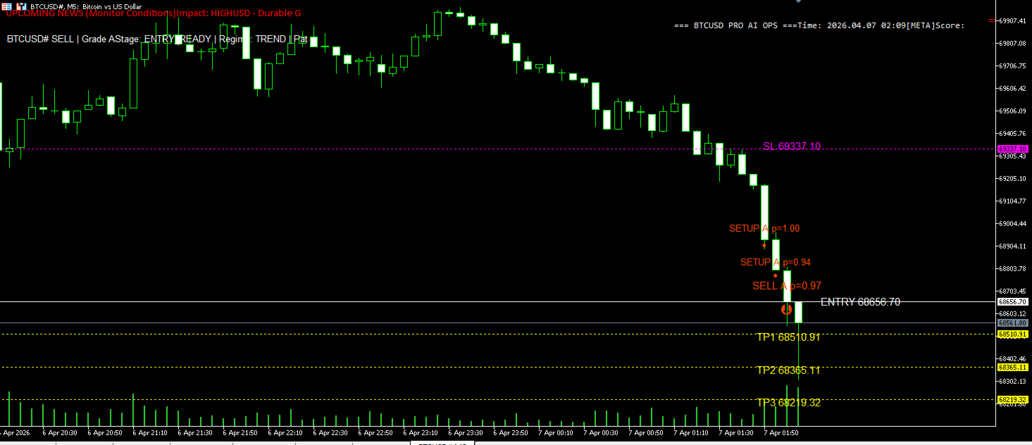 Built specifically for BTCUSD / BTCUSD#, this solution works only on the M5 timeframe. Its purpose is to help traders read short-term price action with more discipline by combining trend logic, market-condition filters, momentum timing, spread protection, signal quality, and structure-based evaluation into one professional signal workflow.