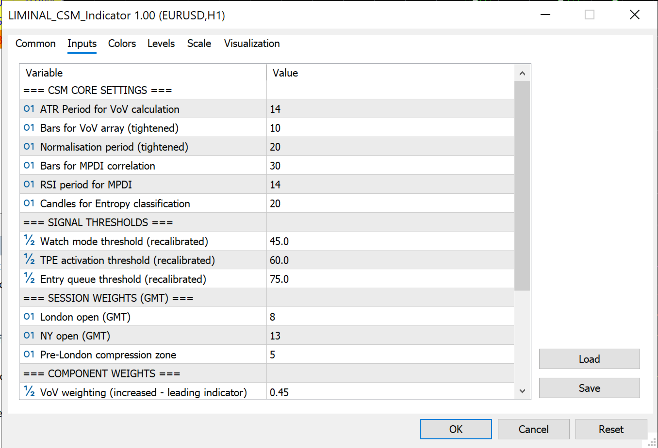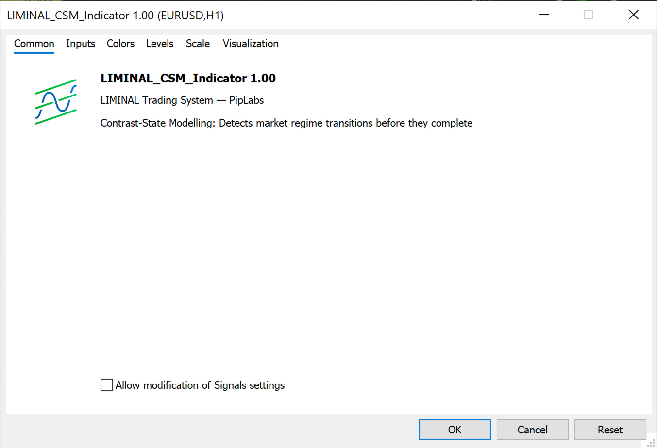 Optimised for H1+ timeframes. Designed as the signal layer within the LIMINAL multi-agent trading framework but fully functional as a standalone chart indicator.