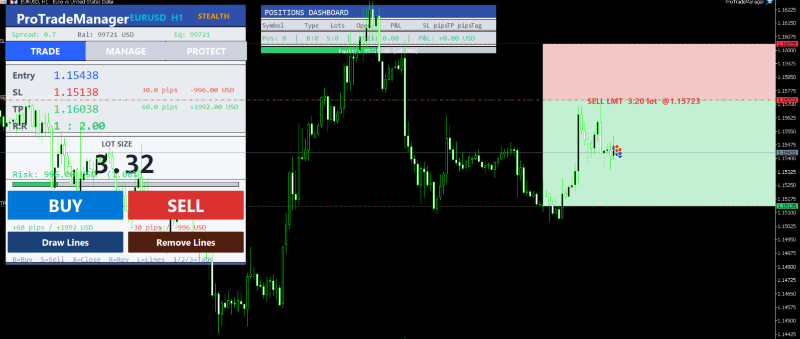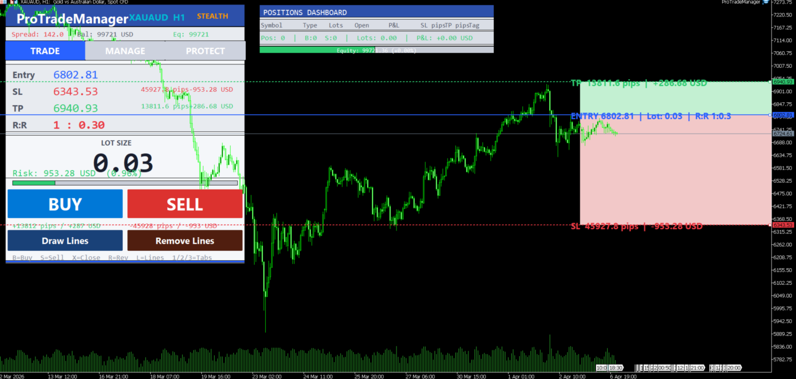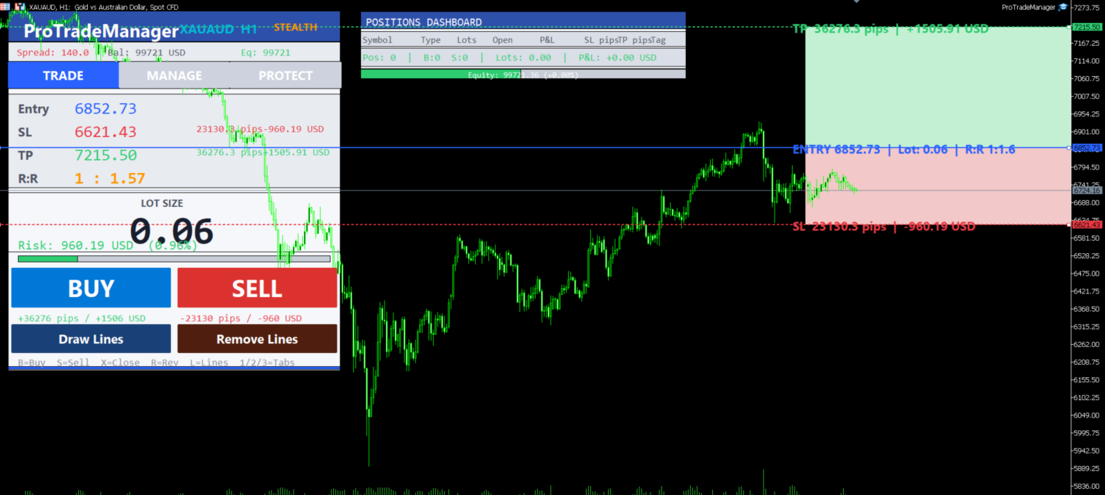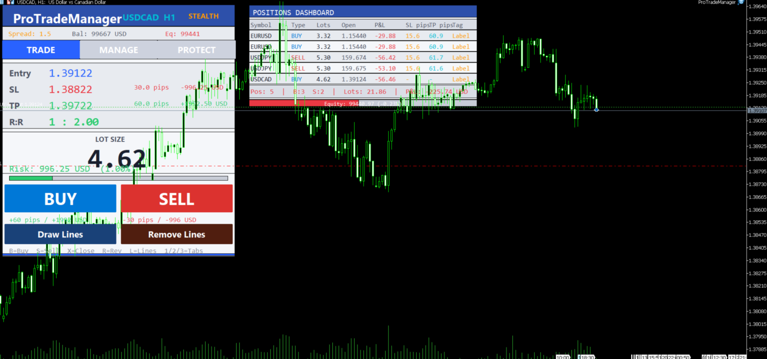 ProTradeManager is an all-in-one on-chart trade management utility that gives you everything you need to plan, execute, and protect trades with precision — from a clean visual panel directly on your chart. No scripting, no manual math. Just draw your lines, set your risk, and click.