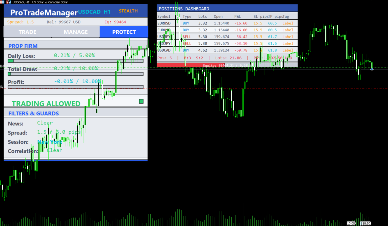 - Integrates with the news filter and spread guard to enforce firm rules automatically