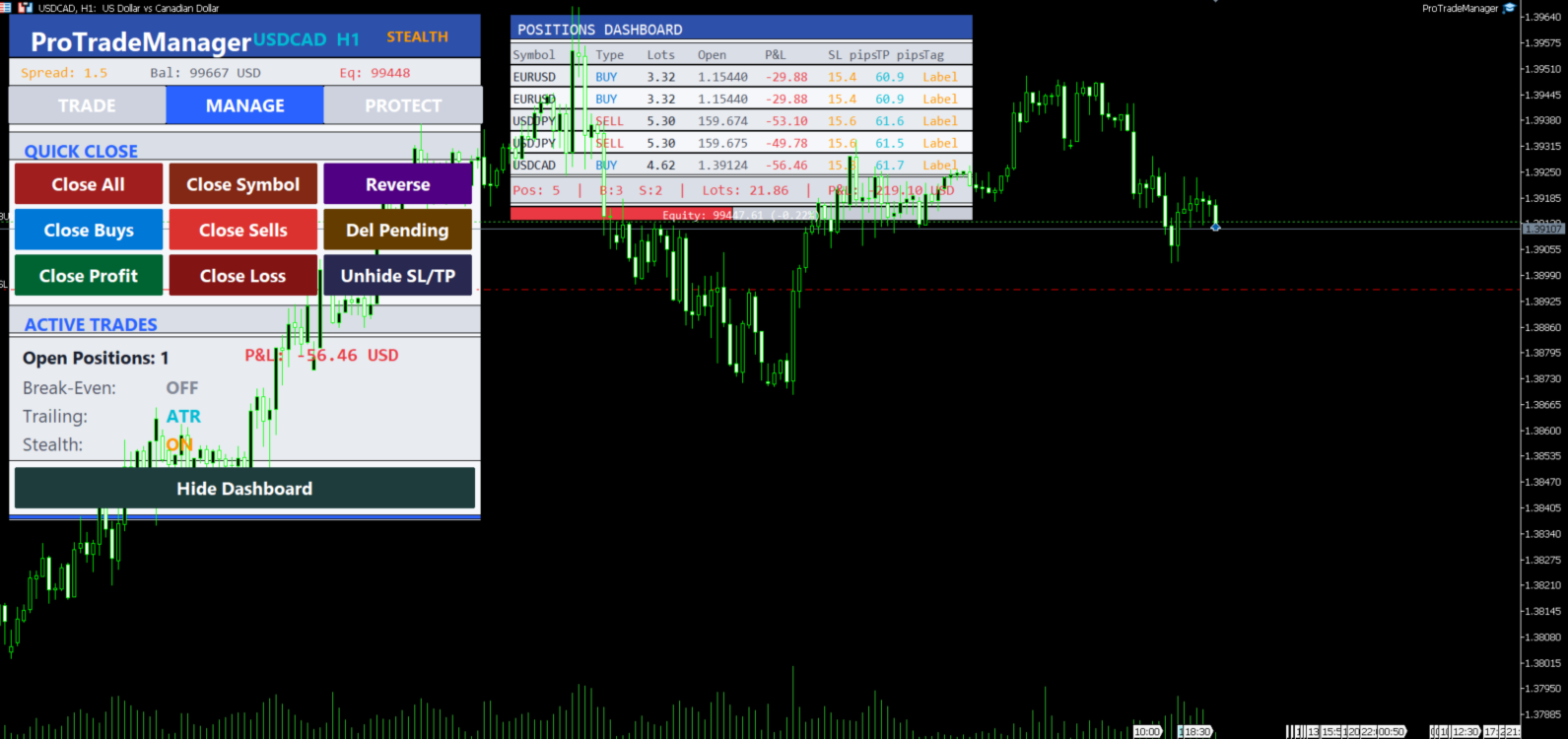 A separate floating dashboard shows all open positions across every symbol: type, lots, open price, live P&L, SL and TP in pips, and trade tag. Updates in place with no flickering.