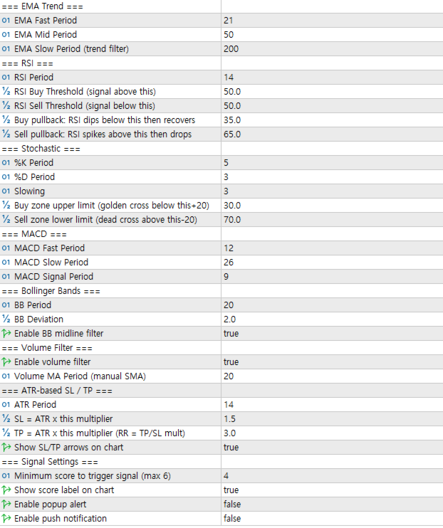 only when the minimum score threshold is met. SL and TP levels are