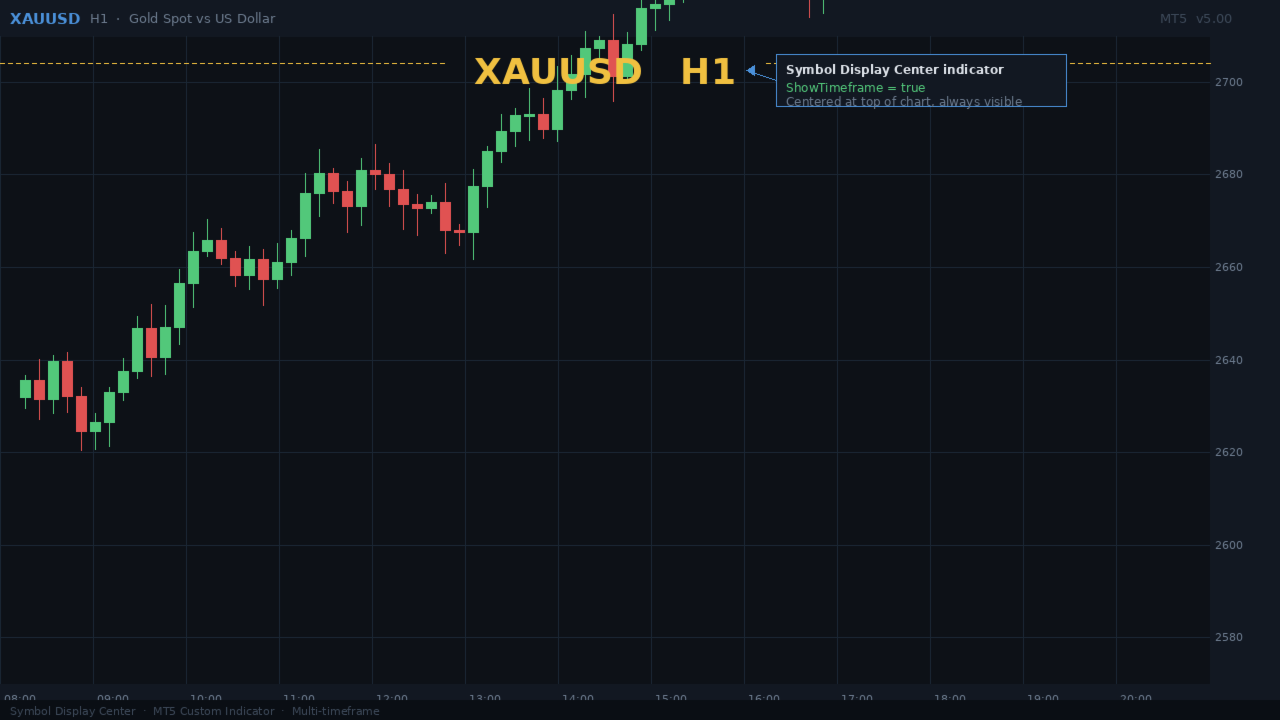 Description: Displays the current chart symbol in large bold text at the top center of the chart. Optionally shows the active timeframe alongside the symbol name. Designed for traders running multiple charts who want instant visual confirmation of the instrument and period at a glance. Automatically recenters when the chart is resized. Customizable color, font size, and vertical position.