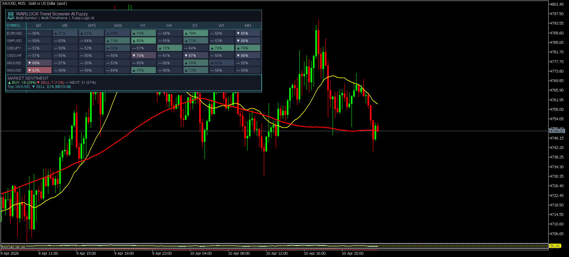 WARLOCK Trend Screener AI Fuzzy MT5 ti offre il vantaggio sleale di vedere la forza del trend dell'intero mercato in un'unica dashboard professionale — con numeri di probabilità reali che funzionano davvero.