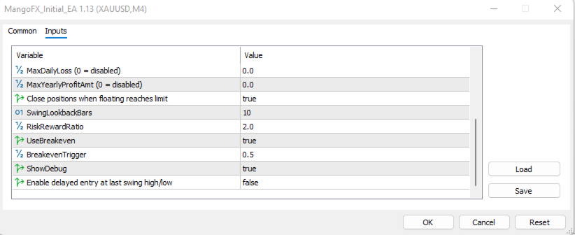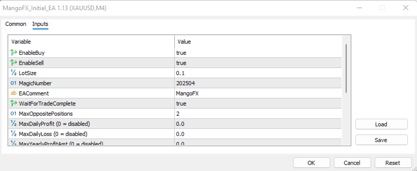 MaxDailyLoss - Closed daily loss limit (0 = disabled). Prevents further trading after hitting the loss.