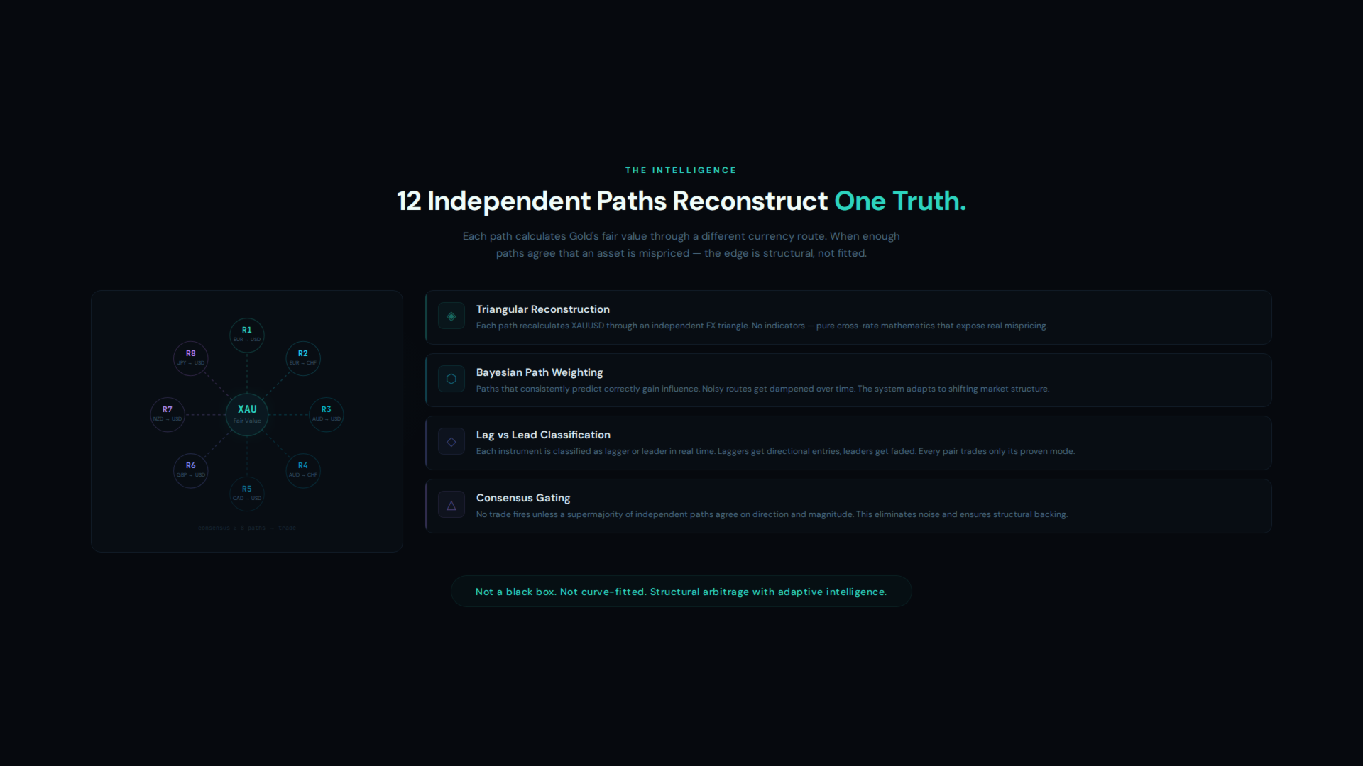 ss Forex, Commodities, and Indices. It reconstructs fair value through multiple independent currency routes — and when the actual market price deviates from where the network says it should be, it identifies the laggard and trades the convergence.