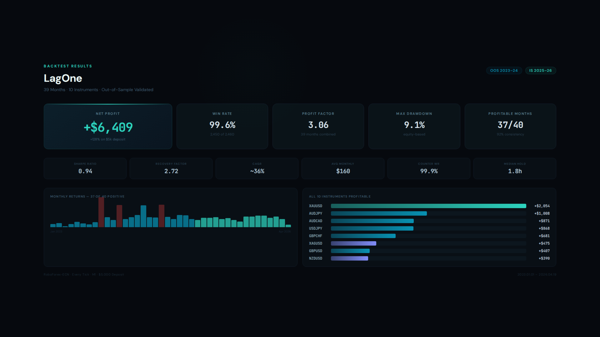 This means the EA doesn't just execute a fixed strategy — it refines itself in real time. Market conditions shift, correlations break down and reform, and LagOne's signal weighting evolves with them. The system you run today is smarter than the one you ran last month.