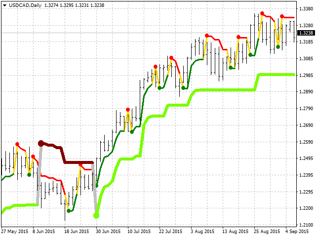 В приложенных изображениях - один из вариантов использования индикатора - одновременно двух с различными параметрами чувствительности. Более чувствительный индикатор идентифицирует точки входа/выхода, менее чувствительный - указывает направление тренда и уровни стопа. Это один из простейших примеров. Индикатор может эффективно комбинироваться с множеством других индикаторов технического анализа.