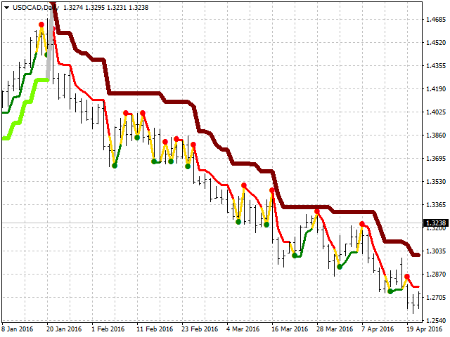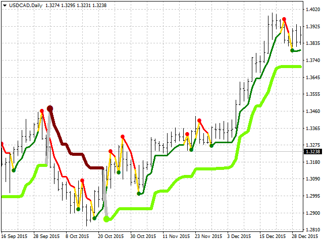 The currently presented version of the indicator has two calculation modes: At a sensitivity value less than 0, the closing price is used to calculate the indicator values. At values of sensitivity of the indicator more than 0, the prices of the maximum and minimum are used.