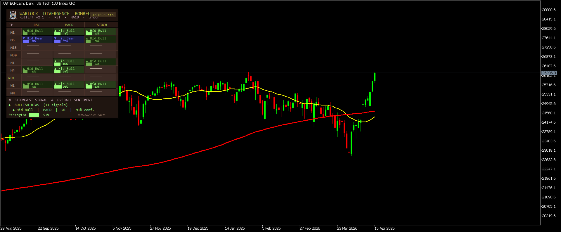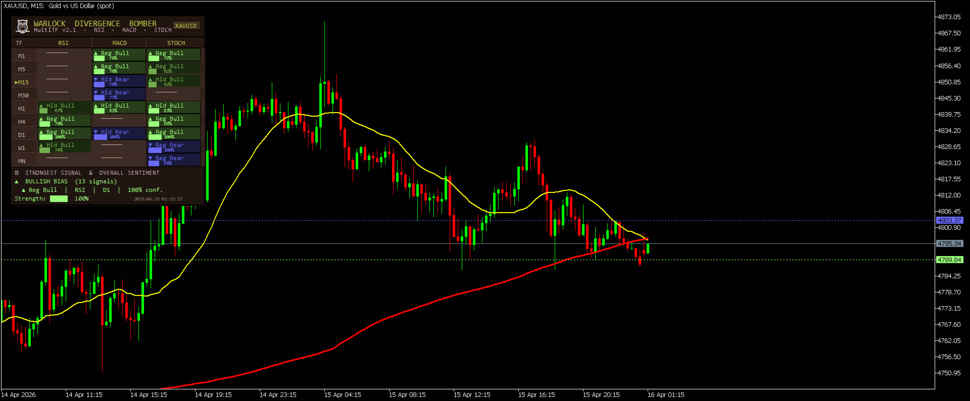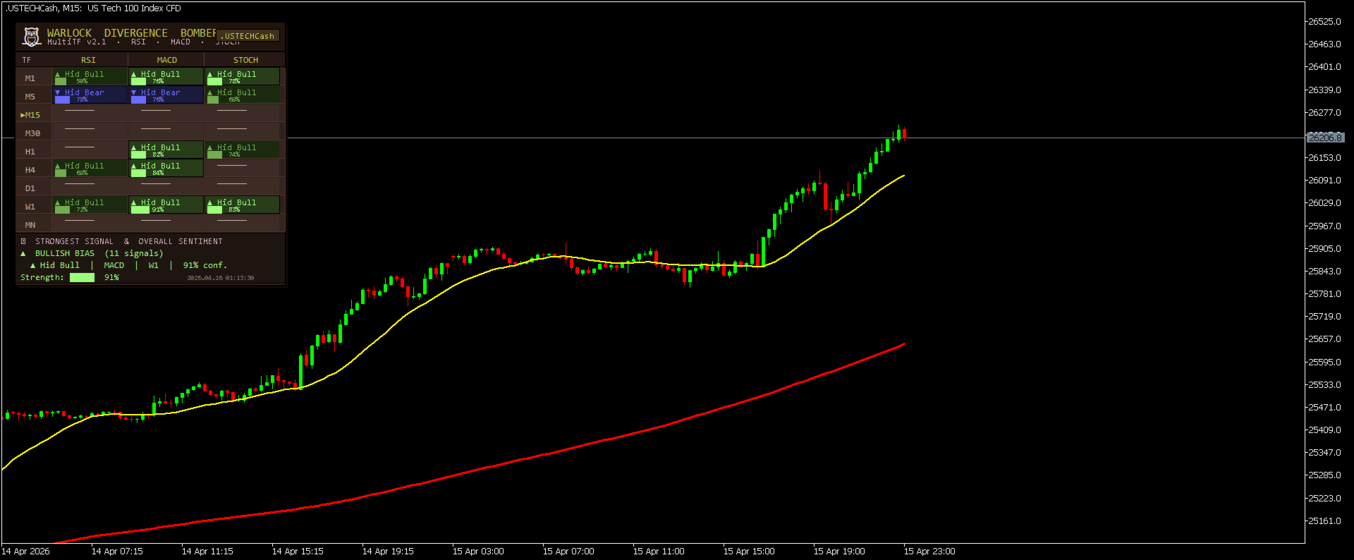 WARLOCK Divergence Bomber MultiTF MT5 is a premium, institutional-grade divergence scanner that combines the three most powerful oscillators — RSI, MACD, and Stochastic — across 9 timeframes simultaneously (M1, M5, M15, M30, H1, H4, D1, W1, MN1).