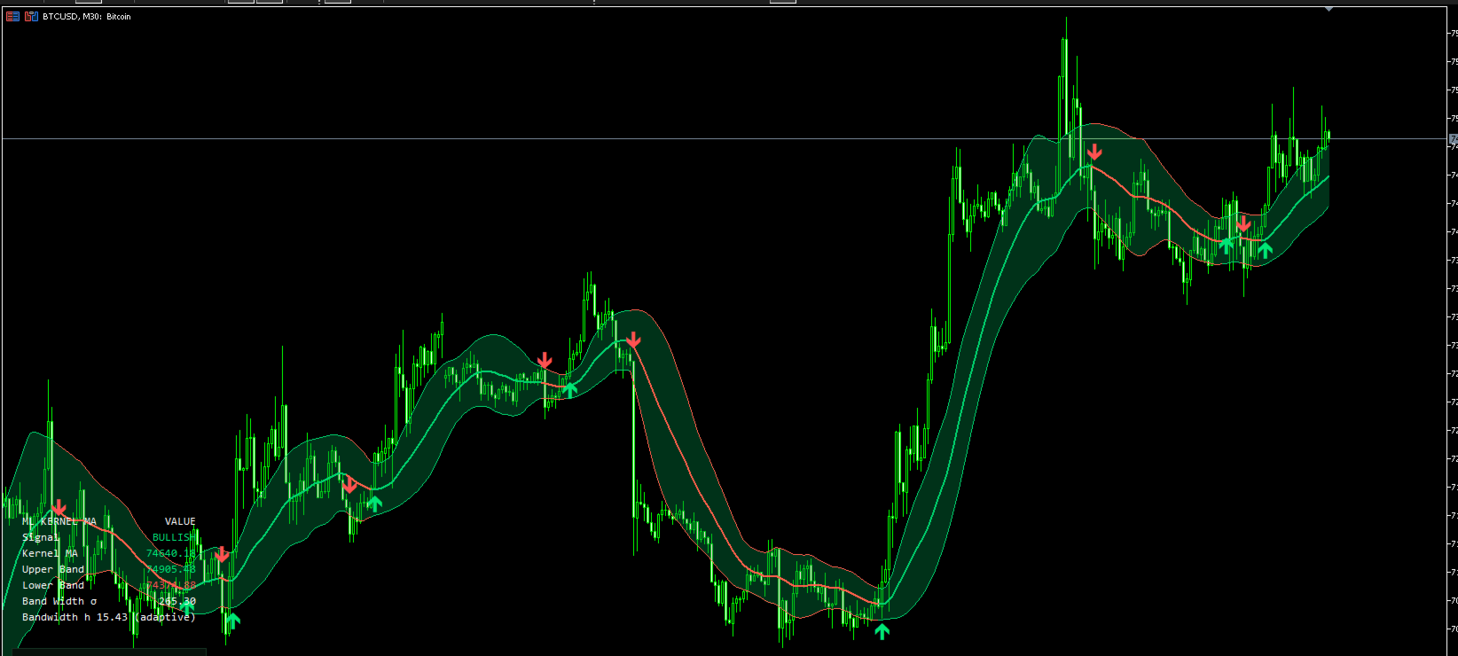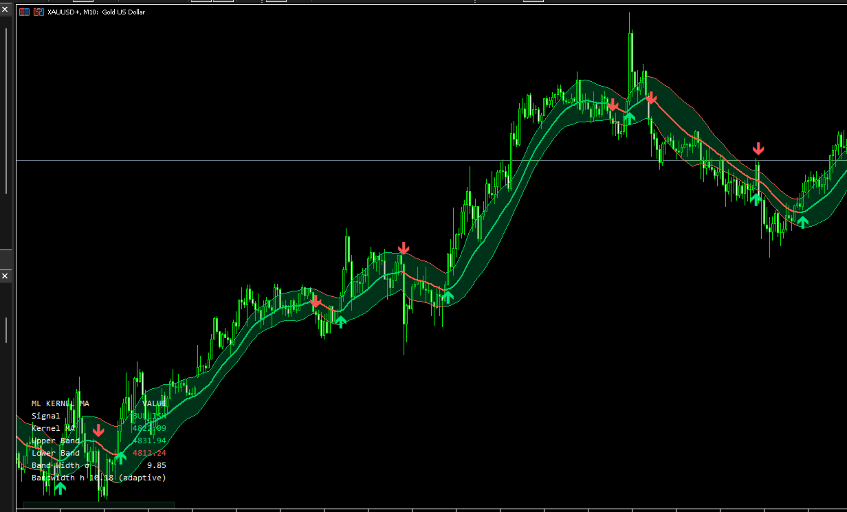 On-chart panel shows current signal, kernel MA value, both bands, realized sigma, and the active bandwidth — updated every tick.