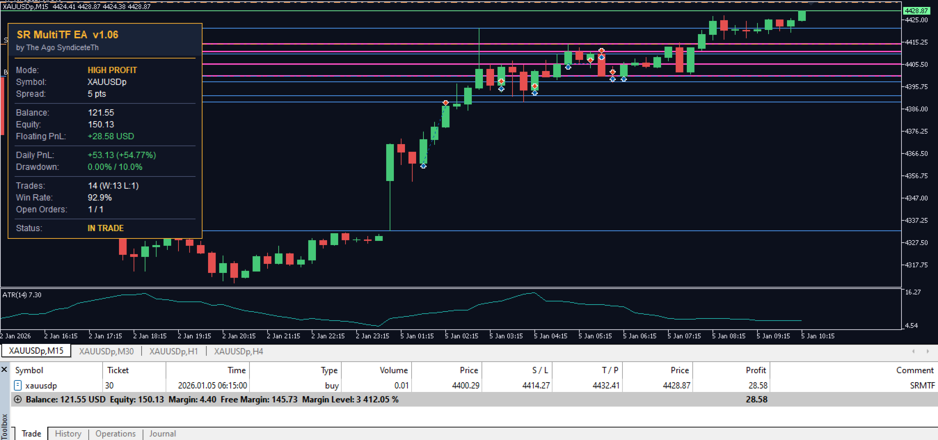 Tags: Support Resistance, Multi-Timeframe, Scalping, Swing Trading, Gold EA, XAUUSD, Risk Management, Dashboard, MT5, Price Action, No Martingale
