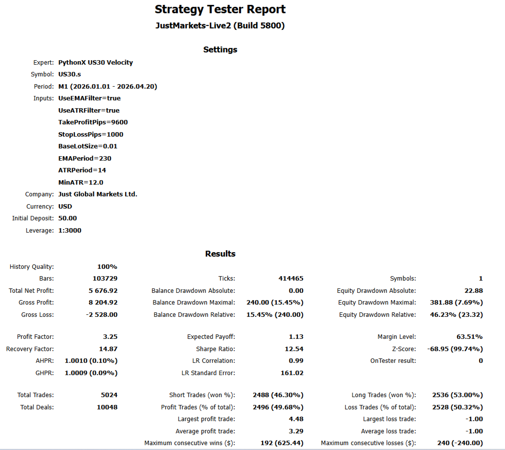 PythonX US30 Velocity EA