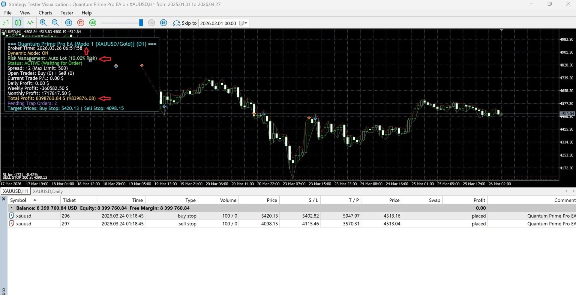 Quantum Prime Pro is a fully equipped trading robot featuring specially developed hidden strategies, both operating on the daily (D1) timeframe.
