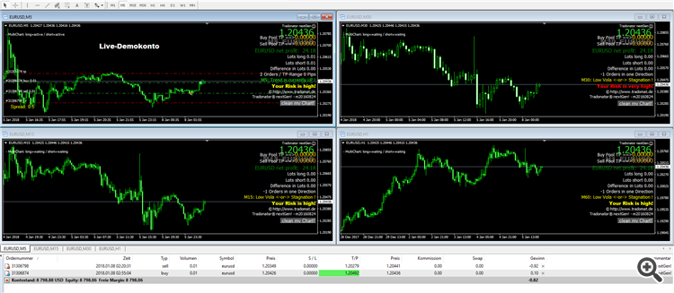 Der Expert handelt auf mehreren Charts, beginnend mit dem kleinsten Timeframe. Läuft es gut bleibt er dort, läuft es gegen ihn wechselt er nach der definierten Tradeanzahl in den nächst höheren Timeframe. Man kann für jeden Chart eigene Settings verwenden, normalerweise leicht erhöhte Lotzahlen und eine höhere Tradingrange sowie ein höheres Profitziel. So wird er in kritischen Phasen langsamer, fährt aber schlussendlich höhere Gewinne ein!