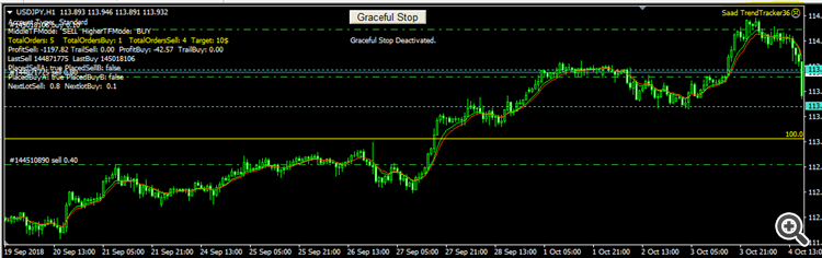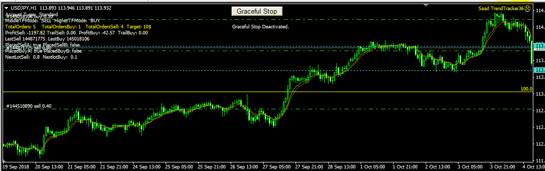 By default graceful stop is deactivated. If you enable it the bot will not open any initial trades (but will continue to open recovery trades) so after a while, once all trades have closed, it will stop.