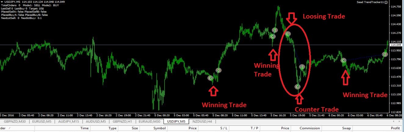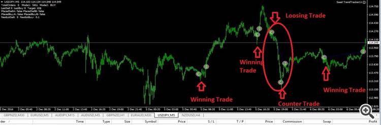 For loosing trades below attach image is self explanatory, counter trade is opened by Trend Tracker using Middle TF configured in inputs.