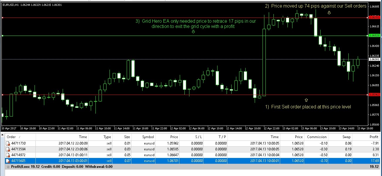 3) Price moved up against our Sell Orders by 74 pips to 1.06701 when the last Grid Order was placed