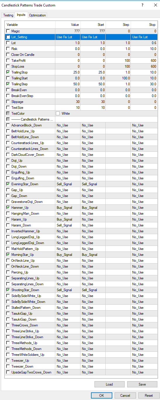 Hi, on the chart the balance/equity has large drawdown, this can be avoided if we put StopLoss. I would recommend to optimize each candlestick pattern on options take profit, stop loss, trailing stop. Then, for each candlestick patterns to select the optimal settings, currency pair, timeframe. We should not strive to collect all parameters in a single EA on a single chart. EA allows you to customize the trade for each candlestick pattern on a separate chart.