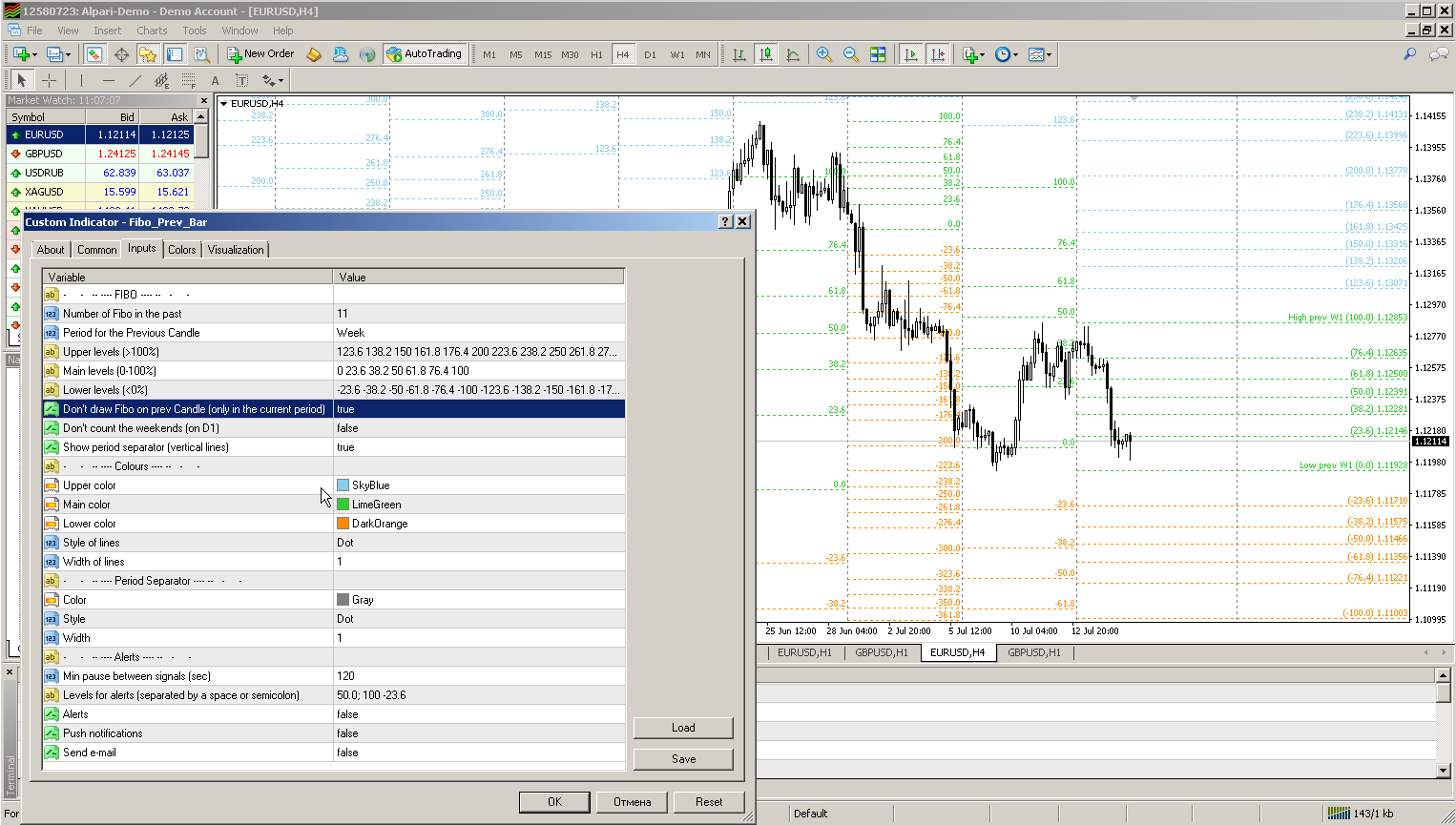 То есть Фибо-уровень будет, как и прежде, рассчитываться по предыдущему бару, но отрисовываться будет только на текущем баре-периоде. Это нужно для анализа истории.