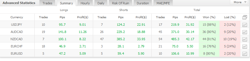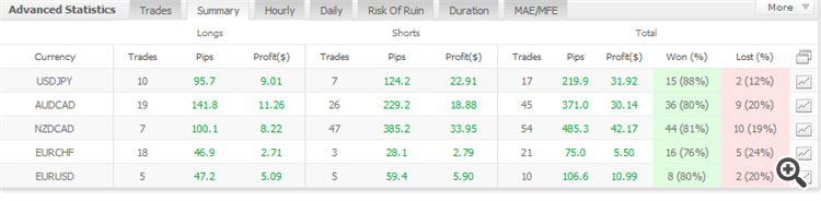RECOMMENDED pairs: EURCHF, EURUSD, AUDCAD, USDJPY, NZDCAD.