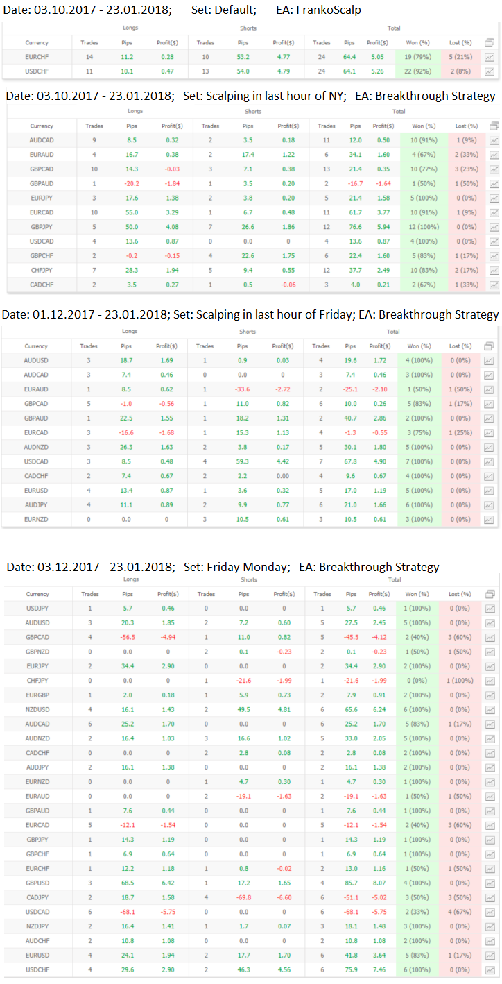 Proceeding from tests which I have done a collection of sets "Friday Monday" looks the most impressive, it has yielded productive result on all currency pairs for which I held testing. 28 currency pairs! This diversification in one strategy looks very impressively. On my real test accounts the collection of sets "Scalping in last hour of Friday" looks not less successful therefore so far I divide risks between them wall-paper on the accounts. Since 2018 I will open PAMM-accounts specially under these strategies. They have to be convenient.