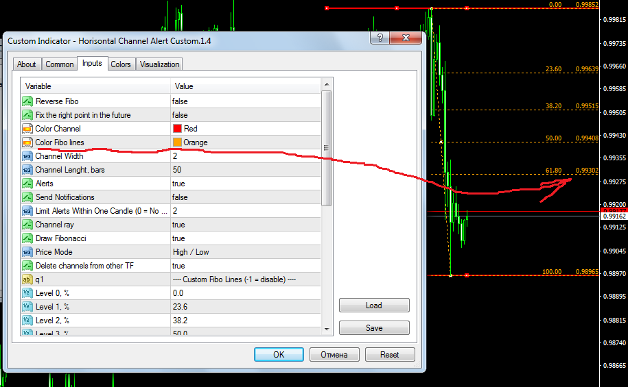 у основных (красных) линий есть точки, крайние точки отвечают за размер - ширину/высоту фибо, центральная помогает перетащить целиком канал влево вправо