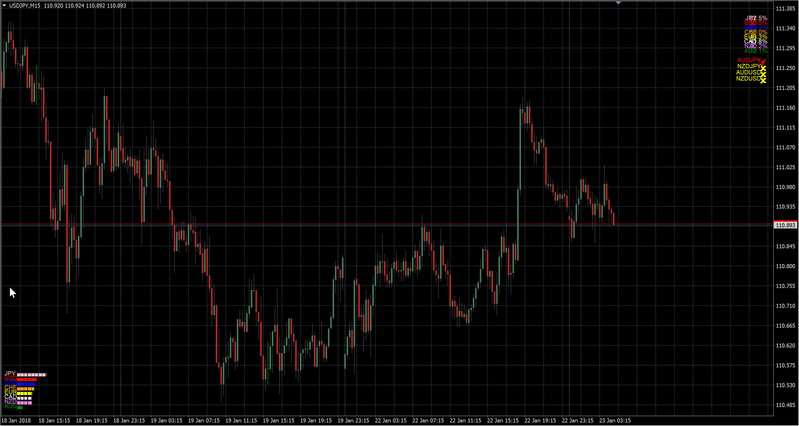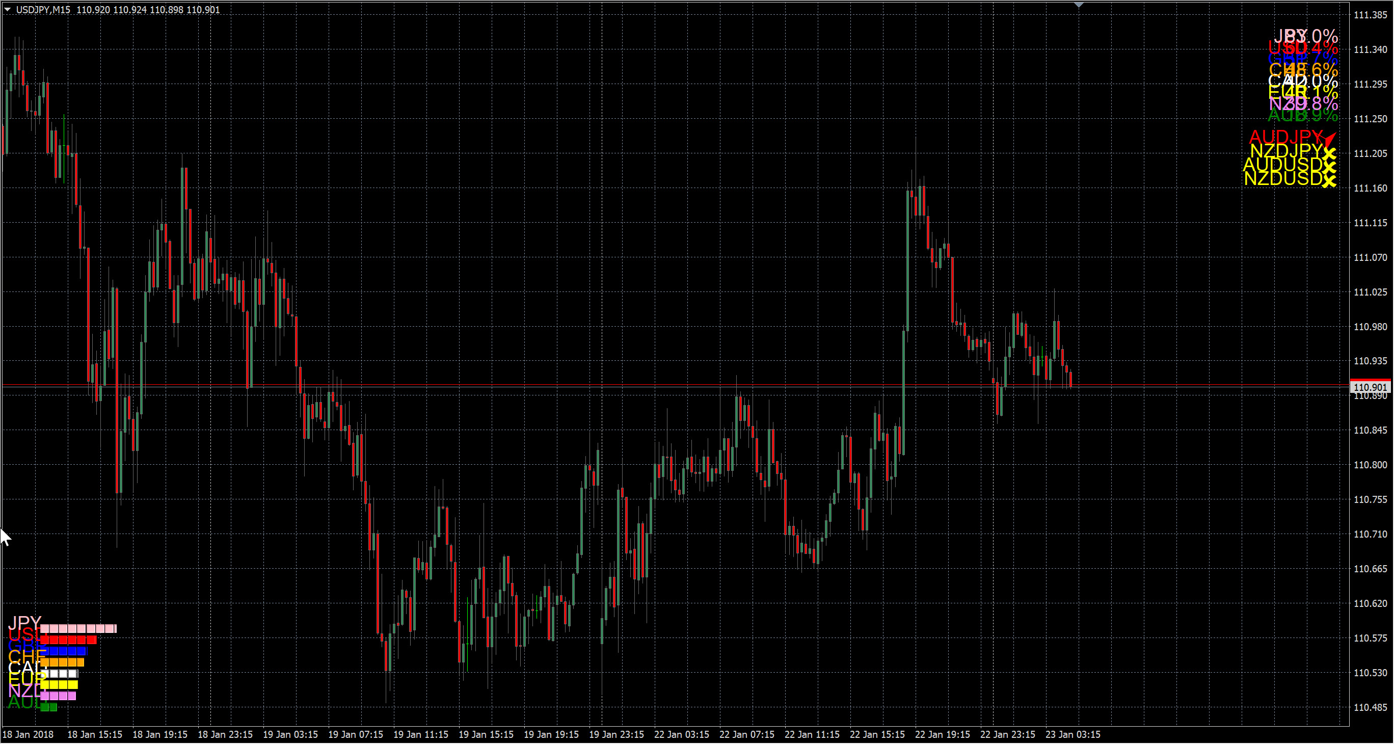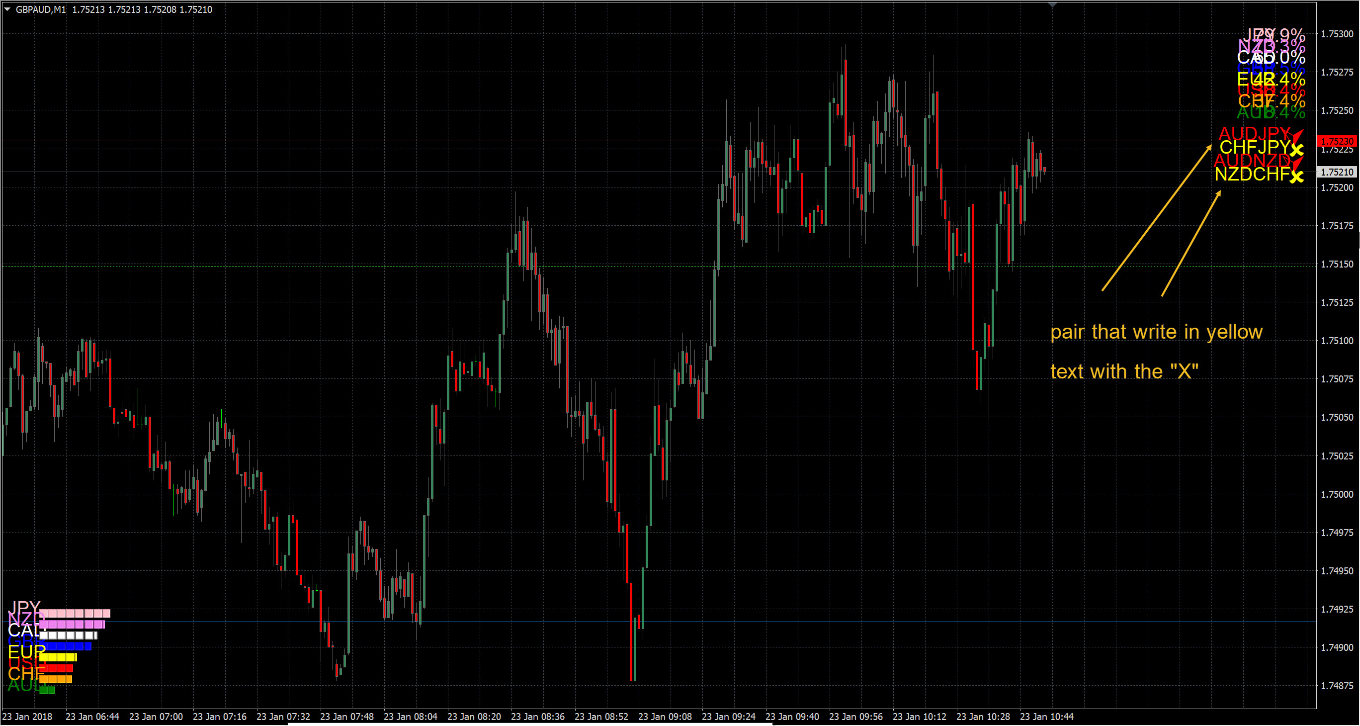 The 4 pairs on that are the 2 strongest and 2 weakest currency. On your photo the strongest are JPY and NZD and the weakest are CHF and AUD... an green upward arrow represents the pair is going up and a red arrow going down it means you have to sell the pair. On the other hand, "X" means the currency is not strong or weak enough to be trade. For you weakest pair which is CHF is greater than 30%.. Note that currency greater than 30% are not considered weak yet. As such, CHF pairs will be marked as "X" and you have to wait for it to be marked going down or going up. This are only shown on the right side to give you hint which pairs you have to monitor