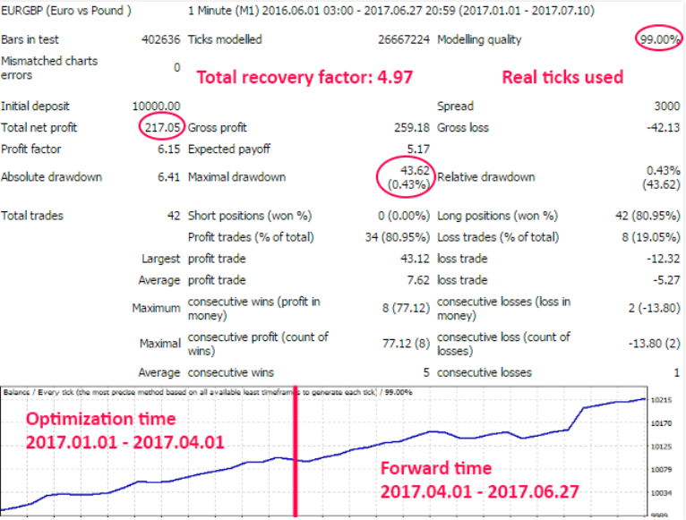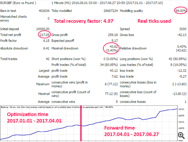 Thanks Alex, this is where it gets a bit confusing. If I look at your test for EURGBP below the EA made $217 over a period of just over 6 months against a balance of $10,000 - which is 4.34% per annul, and nothing to write home about. Yet the screenshot shows profit factor of 6.15? Where am I going wrong?