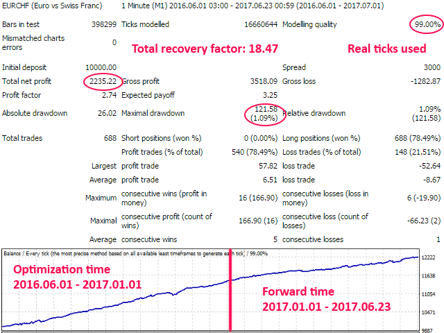 So, what I can see is using standard risk of 1% the projections are as follows: EURCHF 18% pa, EURGBP 2.4% pa, EURUSD 10.3% pa, USDCHF 6.3% pa. Now that you have run the back tests from Jan 2016 the next step is to run the out sample forward test. In order to do this properly the already optimized inputs/parameters must not be tampered with. Pick a 12 mth period, say the whole of 2015 and run the EA against that period all the while pretending that this is a forward live sample (EA doesn't know otherwise). At the completion of that exercise you will know just how good this EA may or may not be. Look forward to seeing the results of that process.