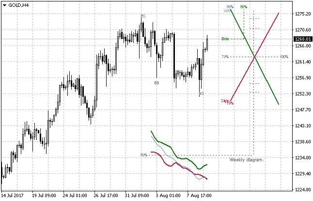The indicator shows two diagrams. On the right - this diagram at the current moment, under the chart - this diagram as events unfolded in time.