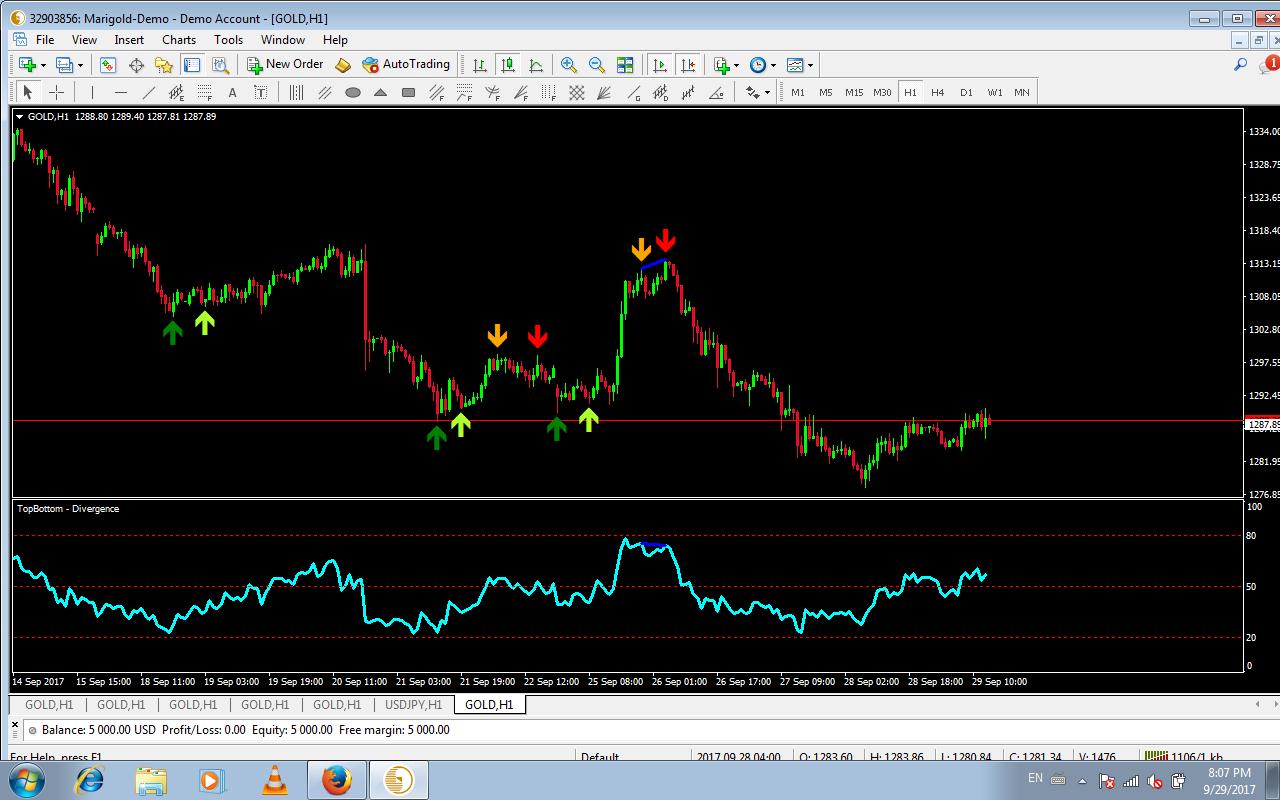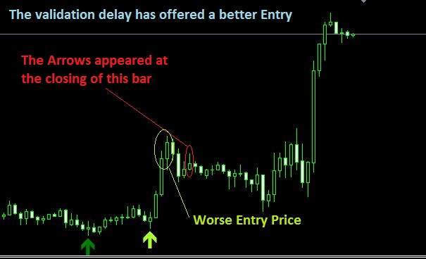 The arrows appear at the closing of around 2 to 7 candles after the second top/bottom has occurred. This happens because the algorithm has to confirm whether the tops/bottoms detected are valid before showing any arrows. The validation allows for clearer signals and better entry prices.