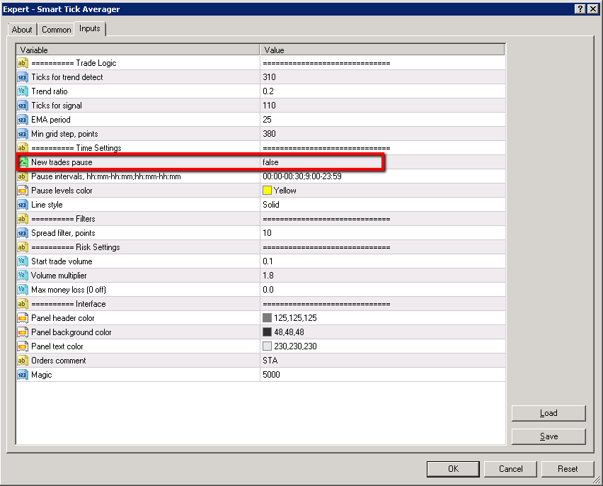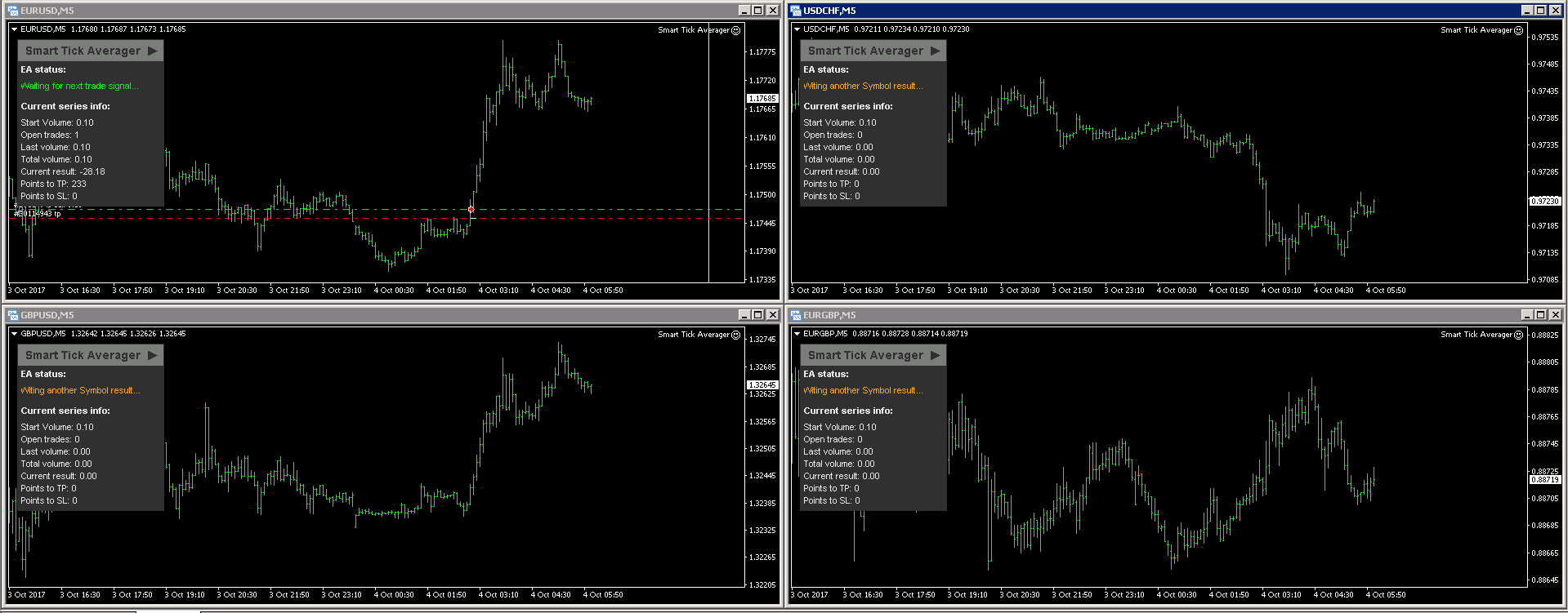 Hi Dmitry, I have a losing open position on one pair and it says waiting on next trade signal with the yellow bar showing when to pause. Does all of that look good? What concerns me is that the other 3 charts are saying "waiting on another signal result" when I have set "pause for new trades" to false. Should they not be searching trend for a new signal instead of being on hold? Also why are there no yellow pause interval bars on the other 3 charts?