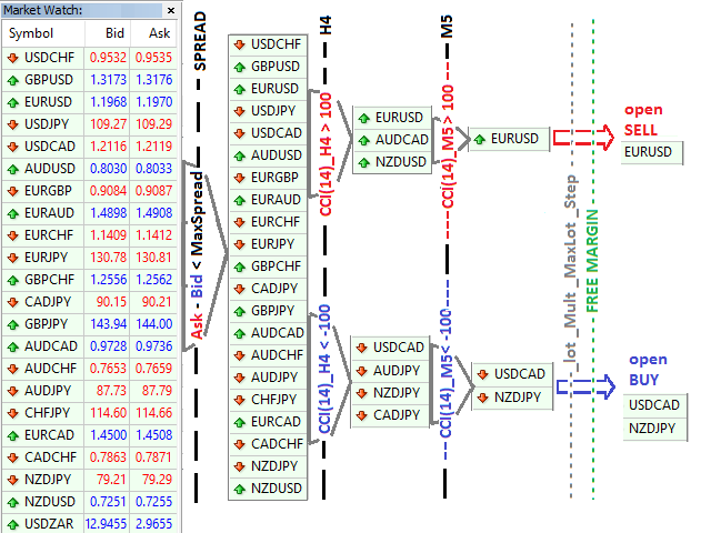 - если у любой из выбранных пар на графике H4 индикатор CCI(14) < -100 или > 100 переходим делее (используются данные последней закрытой свечи)