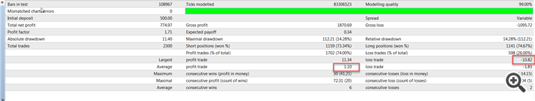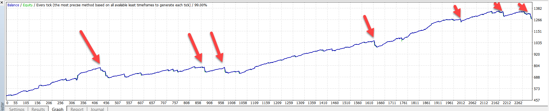 EA loses large amounts at times as shown in the Backtest equity (see red arrows). I tested on GBPUSD default settings. The RR ratio of the EA is 10:1 when it should be < 2.5:1. I don't recommend the EA for live trading especially with $2000 excessively high purchase price. Money management needs improvement.