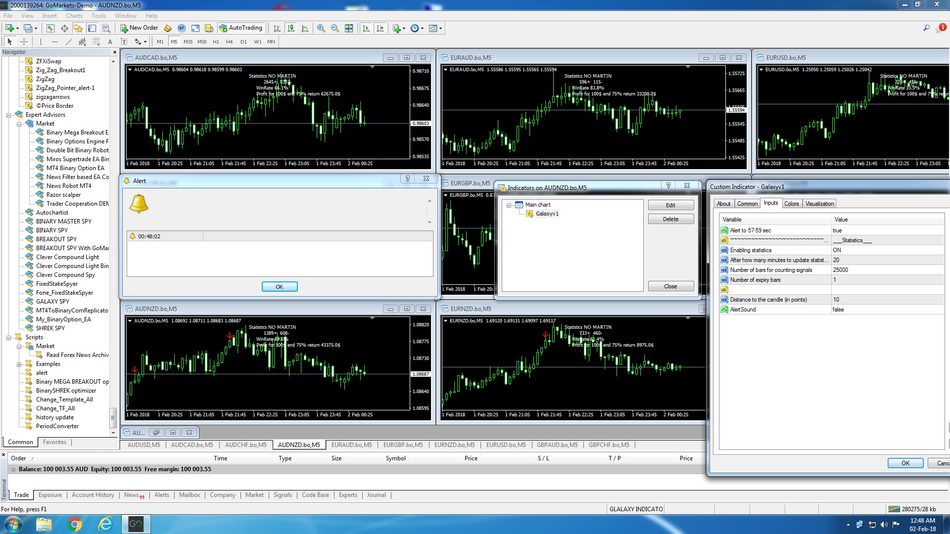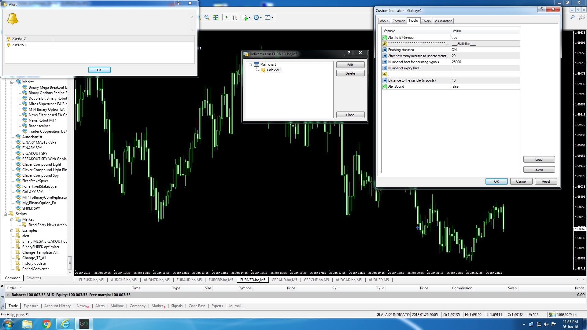 Sorry I misled you, the MT4 runs on Go Markets demo and my EA runs on Binary.com. Go markets is not the problem as your arrows appear and some remain but I NEVER get an alert. The alert and the arrows are generated by your indicator and displayed by MT4 and has nothing to do with Go Markets. The alert is turned on in your indicator options, I can see your indicator arrow on the chart but no alert - it is your indicator that is the problem. See in the attached there are arrows on AUDNZD but no alerts in the alert box. Please fix this or I want a refund