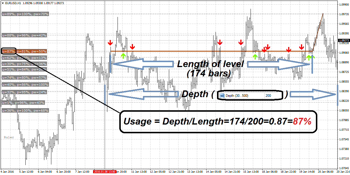 Each time a candle is formed, a search for extremes is performed. The depth of the search is determined by the "Depth" parameter.